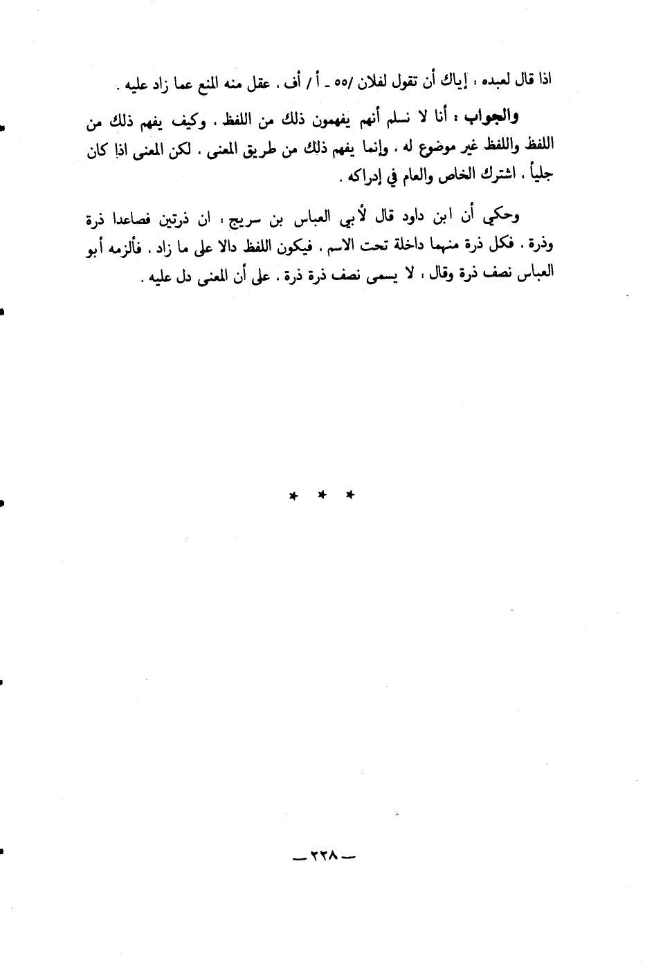 وَحكى أَن ابْن دَاوُد قَالَ لأبي الْعَبَّاس بن سُرَيج أَن ذرتين فَصَاعِدا ذرة وذرة فَكل ذرة مِنْهُمَا دَاخِلَة تَحت الِاسْم فَيكون اللَّفْظ دَالا على مَا زَاد فألزمه أَبُو الْعَبَّاس نصف ذرة وَقَالَ لَا يُسمى نصف ذرة ذرة على أَن الْمَعْنى دلّ عَلَيْهِ