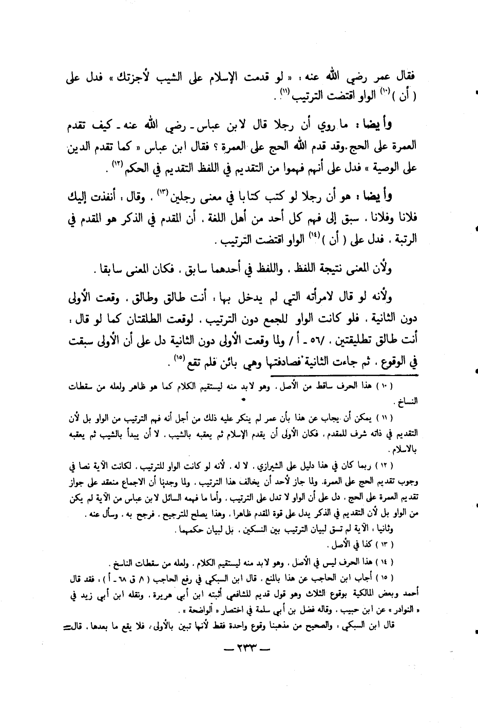 فَقَالَ عمر رَضِي الله عَنهُ لَو قدمت الْإِسْلَام على الشيب لأجزتك فَدلَّ على أَن الْوَاو اقْتَضَت التَّرْتِيب