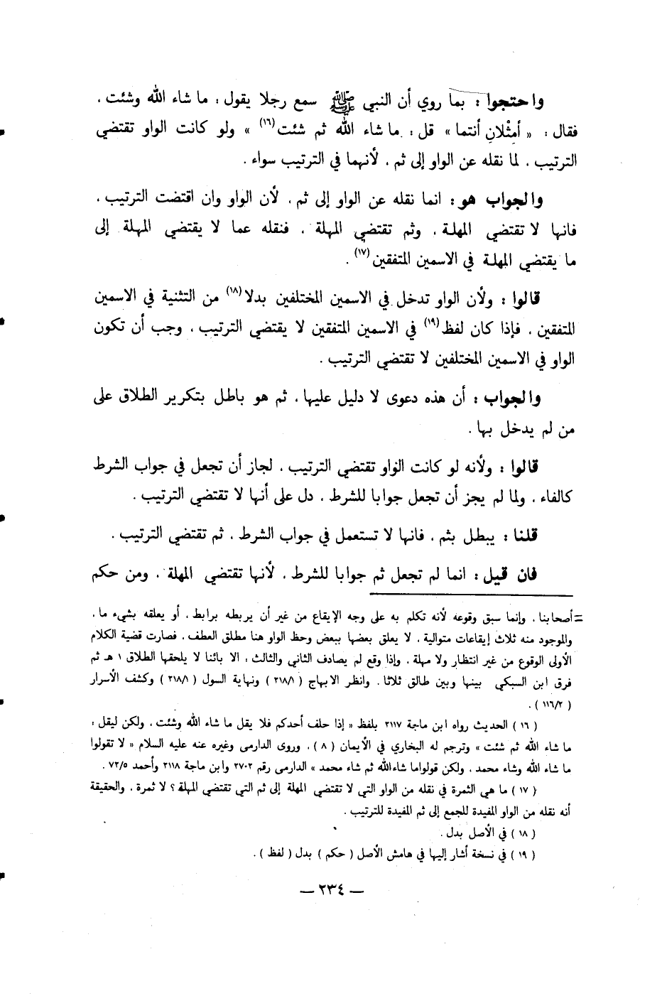 وَاحْتَجُّوا بِمَا رُوِيَ أَن النَّبِي صلى الله عَلَيْهِ وَسلم سمع رجلا يَقُول مَا شَاءَ الله وشئت فَقَالَ أمثلان أَنْتُمَا قل مَا شَاءَ الله ثمَّ شِئْت وَلَو كَانَت الْوَاو تَقْتَضِي التَّرْتِيب لما نَقله عَن الْوَاو إِلَى ثمَّ لِأَنَّهُمَا فِي التَّرْتِيب سَوَاء