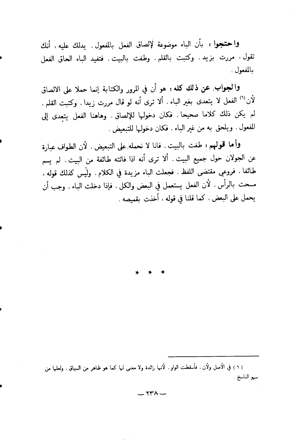 وَاحْتَجُّوا بِأَن الْبَاء مَوْضُوعَة لإلصاق الْفِعْل بالمفعول يدلك عَلَيْهِ أَنَّك تَقول مَرَرْت بزيد وكتبت بالقلم وطفت بِالْبَيْتِ فتفيد الْبَاء إِلْحَاق الْفِعْل بالمفعول