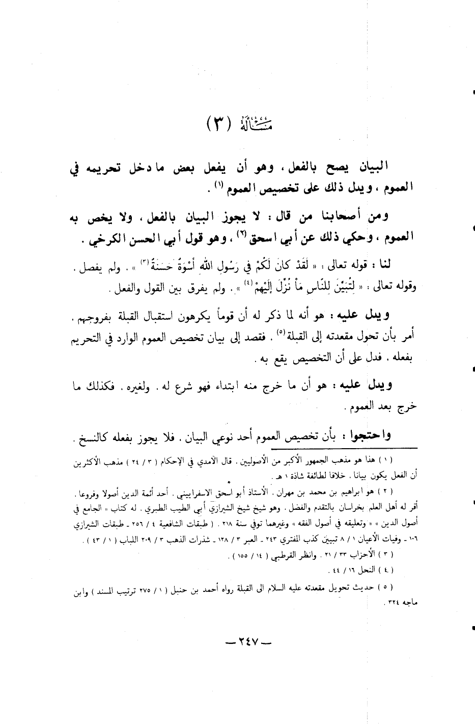 وَمن أَصْحَابنَا من قَالَ لَا يجوز الْبَيَان بِالْفِعْلِ وَلَا يخص بِهِ الْعُمُوم وَحكي ذَلِك عَن أبي إِسْحَق وَهُوَ قَول أبي الْحسن الْكَرْخِي
