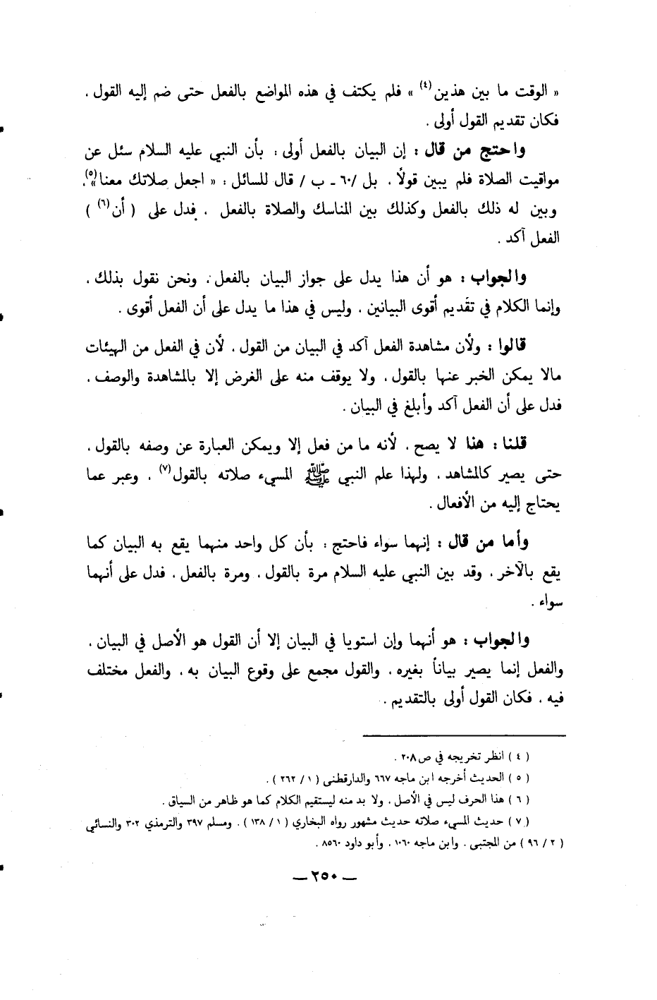 وَاحْتج من قَالَ إِن الْبَيَان بِالْفِعْلِ أولى بِأَن النَّبِي عَلَيْهِ السَّلَام سُئِلَ عَن مَوَاقِيت الصَّلَاة فَلم يبين قولا بل قَالَ للسَّائِل اجْعَل صَلَاتك مَعنا وَبَين لَهُ ذَلِك بِالْفِعْلِ وَكَذَلِكَ بَين الْمَنَاسِك وَالصَّلَاة بِالْفِعْلِ فَدلَّ على أَن الْفِعْل آكِد