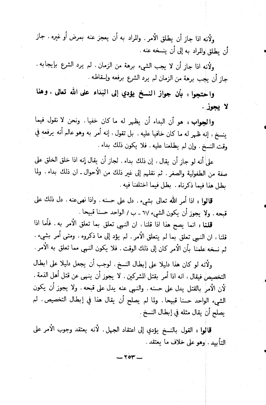 قَالُوا القَوْل بالنسخ يُؤَدِّي إِلَى اعْتِقَاد الْجَهْل لِأَنَّهُ يعْتَقد وجوب الْأَمر على التَّأْبِيد وَهُوَ على خلاف مَا يعْتَقد