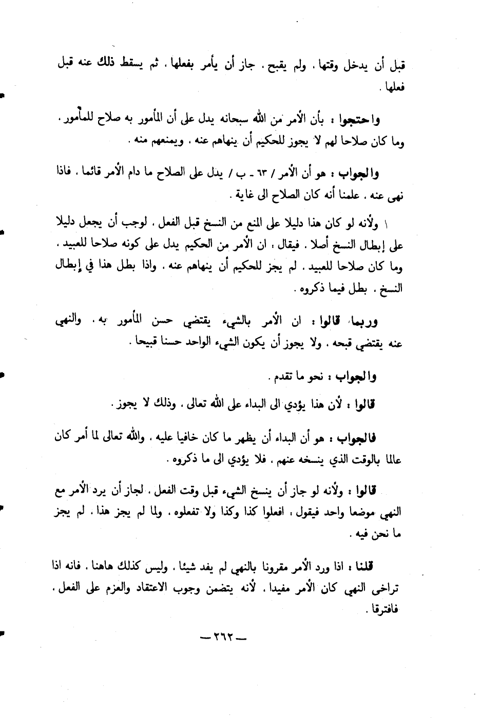 وَلِأَنَّهُ لَو كَانَ هَذَا دَلِيلا على الْمَنْع من النّسخ قبل الْفِعْل لوَجَبَ أَن يَجْعَل دَلِيلا على إبِْطَال النّسخ أصلا فَيُقَال إِن الْأَمر من الْحَكِيم يدل على كَونه صلاحا للعبيد وَمَا كَانَ صلاحا للعبيد لم يجز للحكيم أَن ينهاهم عَنهُ وَإِذا بَطل هَذَا فِي إبِْطَال النّسخ بَطل فِيمَا ذَكرُوهُ