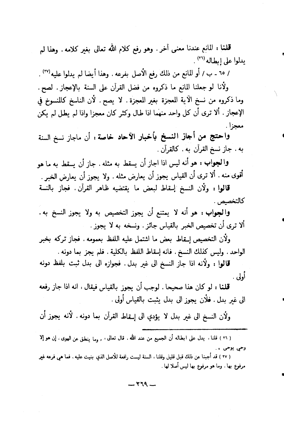 ولأنا لَو جعلنَا الْمَانِع مَا ذَكرُوهُ من فضل الْقُرْآن على السّنة بالإعجاز لصَحَّ وَمَا ذَكرُوهُ من نسخ الْآيَة المعجزة بِغَيْر المعجزة لَا يَصح لِأَن النَّاسِخ كالمنسوخ فِي الإعجاز أَلا ترى أَن كل وَاحِد مِنْهُمَا إِذا طَال وَكثر كَانَ معجزا وَإِذا لم يطلّ لم يكن معجزا