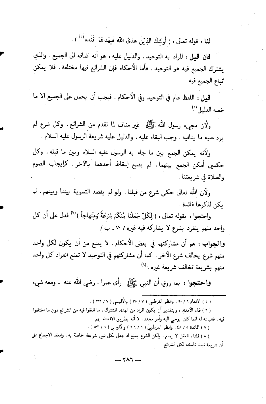 فَإِن قيل المُرَاد بِهِ التَّوْحِيد وَالدَّلِيل عَلَيْهِ هُوَ أَنه أَضَافَهُ إِلَى الْجَمِيع وَالَّذِي يشْتَرك الْجَمِيع فِيهِ هُوَ التَّوْحِيد فَأَما الْأَحْكَام فَإِن الشَّرَائِع فِيهَا مُخْتَلفَة فَلَا يُمكن اتِّبَاع الْجَمِيع فِيهِ