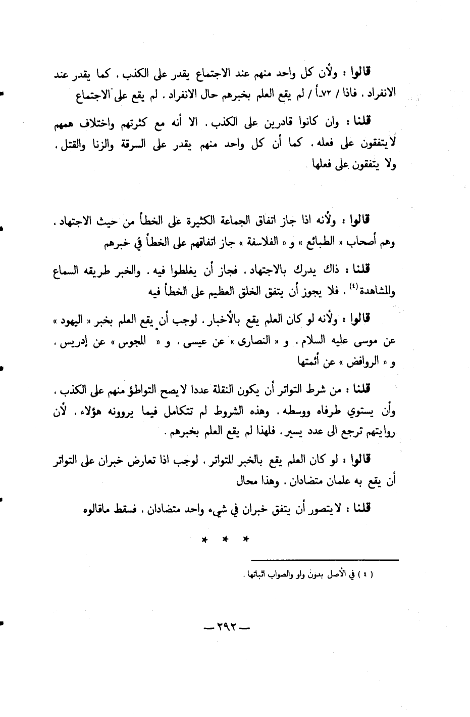 قَالُوا وَلِأَنَّهُ إِذا جَازَ اتِّفَاق الْجَمَاعَة الْكَثِيرَة على الْخَطَأ من حَيْثُ الِاجْتِهَاد وهم أَصْحَاب الطبائع والفلاسفة جَازَ اتِّفَاقهم على الْخَطَأ فِي خبرهم