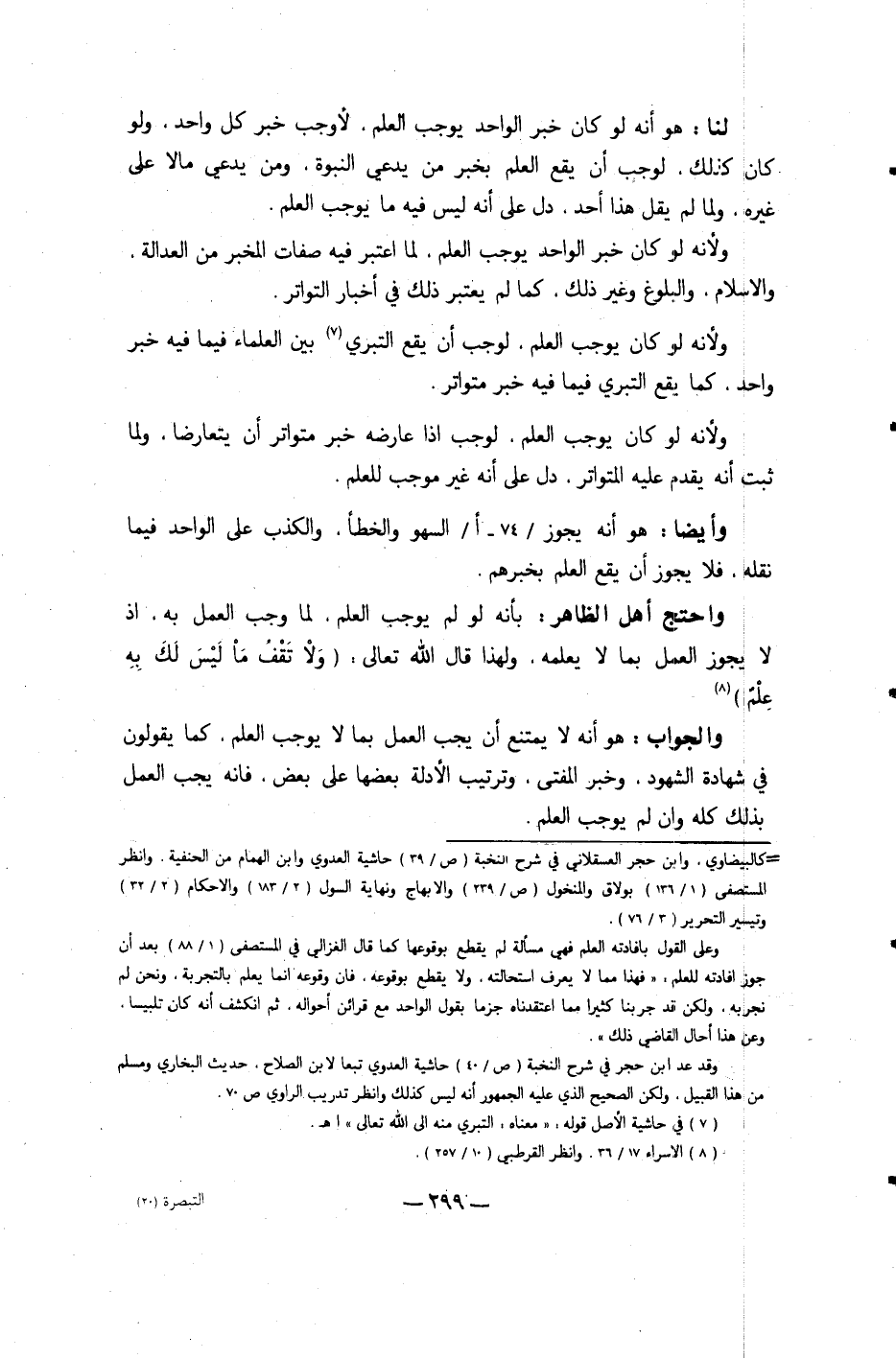 وَلِأَنَّهُ لَو كَانَ يُوجب الْعلم لوَجَبَ أَن يَقع التبري بَين الْعلمَاء فِيمَا فِيهِ خبر وَاحِد كَمَا يَقع التبري فِيمَا فِيهِ خبر متواتر