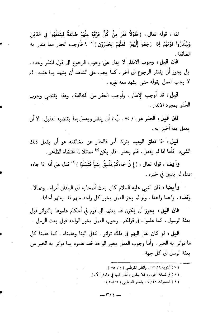 فَإِن قيل وجوب الْإِنْذَار لَا يدل على وجوب الرُّجُوع إِلَى قَول الْمُنْذر وَحده بل يجوز أَن يفْتَقر الرُّجُوع إِلَى آخر كَمَا يجب على الشَّاهِد أَن يشْهد بِمَا عِنْده ثمَّ لَا يجب الْعَمَل بقوله حَتَّى يشْهد مَعَه غَيره
