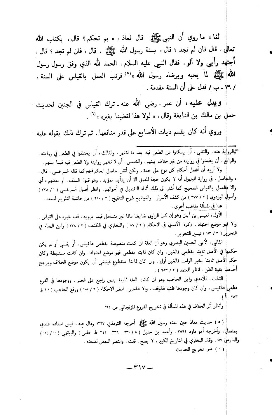 لنا مَا رُوِيَ أَن النَّبِي صلى الله عَلَيْهِ وَسلم قَالَ لِمعَاذ بِمَ تحكم قَالَ بِكِتَاب الله تَعَالَى قَالَ فَإِن لم تَجِد قَالَ بِسنة رَسُول الله صلى الله عَلَيْهِ وَسلم قَالَ فَإِن لم تَجِد قَالَ أجتهد رَأْيِي وَلَا آلو فَقَالَ النَّبِي عَلَيْهِ السَّلَام الْحَمد لله الَّذِي وفْق رَسُول رَسُول الله صلى الله عَلَيْهِ وَسلم لما يُحِبهُ ويرضاه رَسُول الله فرتب الْعَمَل بِالْقِيَاسِ على السّنة فَدلَّ على أَن السّنة مُقَدّمَة