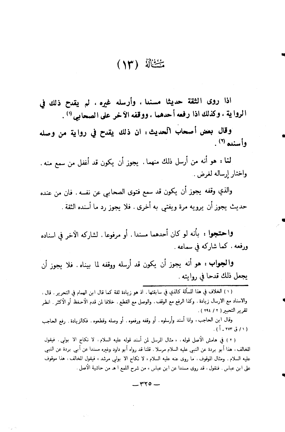 إِذا روى الثِّقَة حَدِيثا مُسْندًا وأرسله غَيره لم يقْدَح ذَلِك فِي الرِّوَايَة وَكَذَلِكَ إِذا رَفعه أَحدهمَا ووقه الآخر على الصَّحَابِيّ