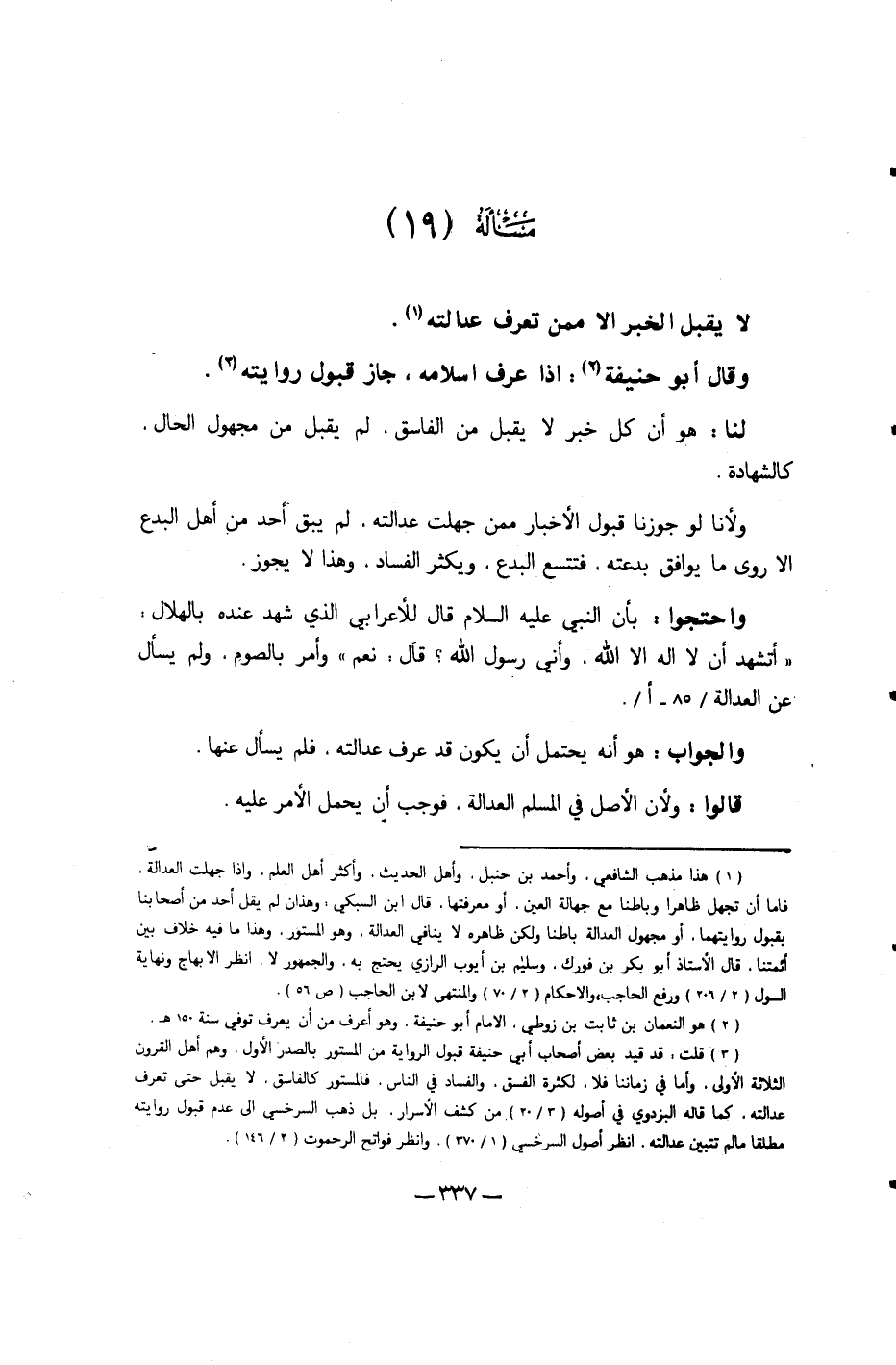 ولأنا لَو جَوَّزنَا قبُول الْأَخْبَار مِمَّن جهلت عَدَالَته لم يبْق أحد من أهل الْبدع إِلَّا روى مَا يُوَافق بدعته فتتسع الْبدع وَيكثر الْفساد وَهَذَا لَا يجوز