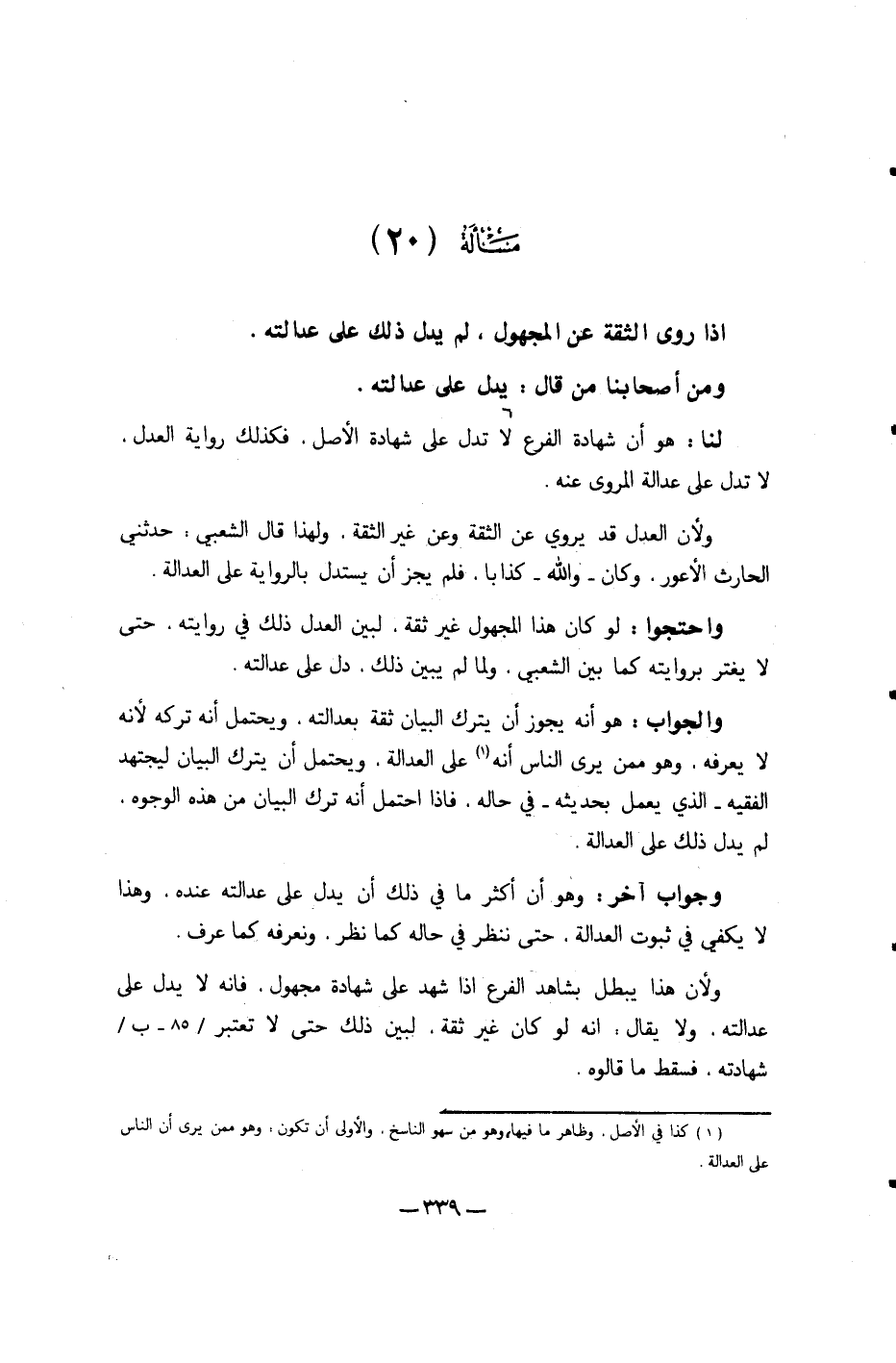 وَالْجَوَاب هُوَ أَنه يجوز أَن يتْرك الْبَيَان ثِقَة بعدالته وَيحْتَمل أَنه تَركه لِأَنَّهُ لَا يعرفهُ وَهُوَ مِمَّن يرى النَّاس أَنه على الْعَدَالَة وَيحْتَمل أَن يتْرك الْبَيَان ليجتهد الْفَقِيه الَّذِي يعْمل بحَديثه فِي حَاله فَإِذا احْتمل أَنه ترك الْبَيَان من هَذِه الْوُجُوه لم يدل ذَلِك على الْعَدَالَة
