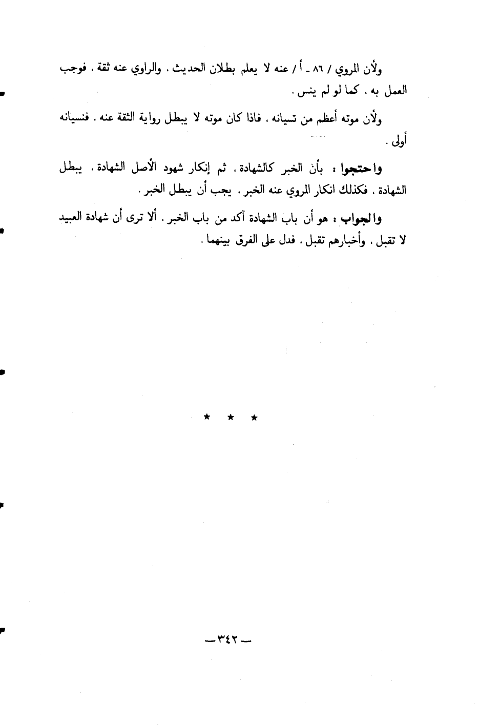 وَاحْتَجُّوا بِأَن الْخَبَر كَالشَّهَادَةِ ثمَّ إِنْكَار شُهُود الأَصْل الشَّهَادَة يبطل الشَّهَادَة فَكَذَلِك إِنْكَار الْمَرْوِيّ عَنهُ الْخَبَر يجب أَن يبطل الْخَبَر