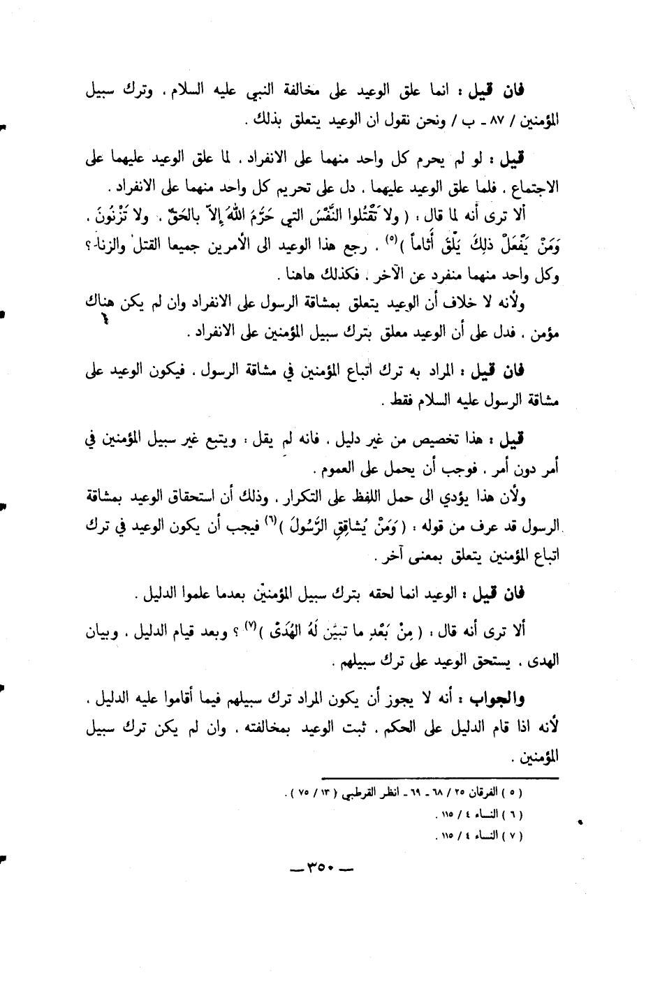 فَإِن قيل إِنَّمَا علق الْوَعيد على مُخَالفَة النَّبِي عَلَيْهِ السَّلَام وَترك سَبِيل الْمُؤمنِينَ وَنحن نقُول إِن الْوَعيد يتَعَلَّق بذلك