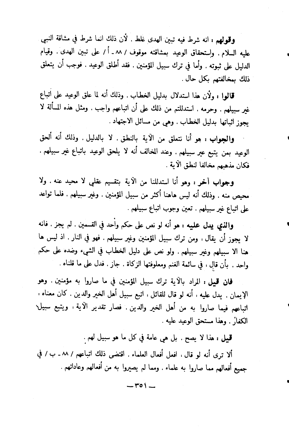 وَجَوَاب آخر وَهُوَ أَنا استدللنا من الْآيَة بتقسيم عَقْلِي لَا محيد عَنهُ وَلَا محيص مِنْهُ وَذَلِكَ أَنه لَيْسَ هَاهُنَا أَكثر من سَبِيل الْمُؤمنِينَ وَغير سبيلهم فَلَمَّا تواعد على اتِّبَاع غير سبيلهم تعين وجوب اتِّبَاع سبيلهم