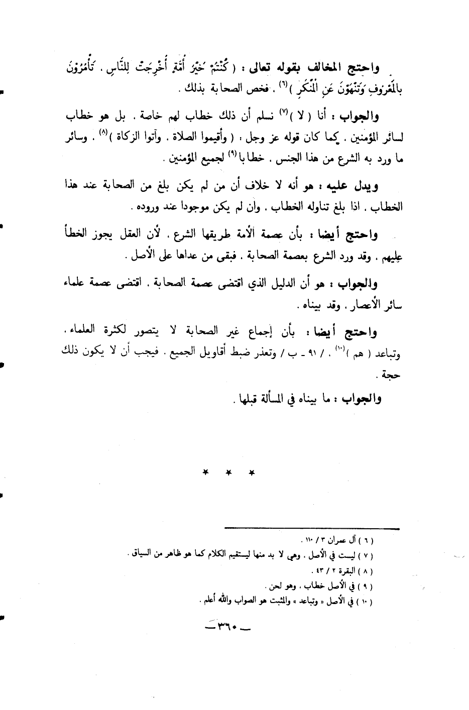 وَاحْتج الْمُخَالف بقوله تَعَالَى {كُنْتُم خير أمة أخرجت للنَّاس تأمرون بِالْمَعْرُوفِ وتنهون عَن الْمُنكر} فَخص الصَّحَابَة بذلك
