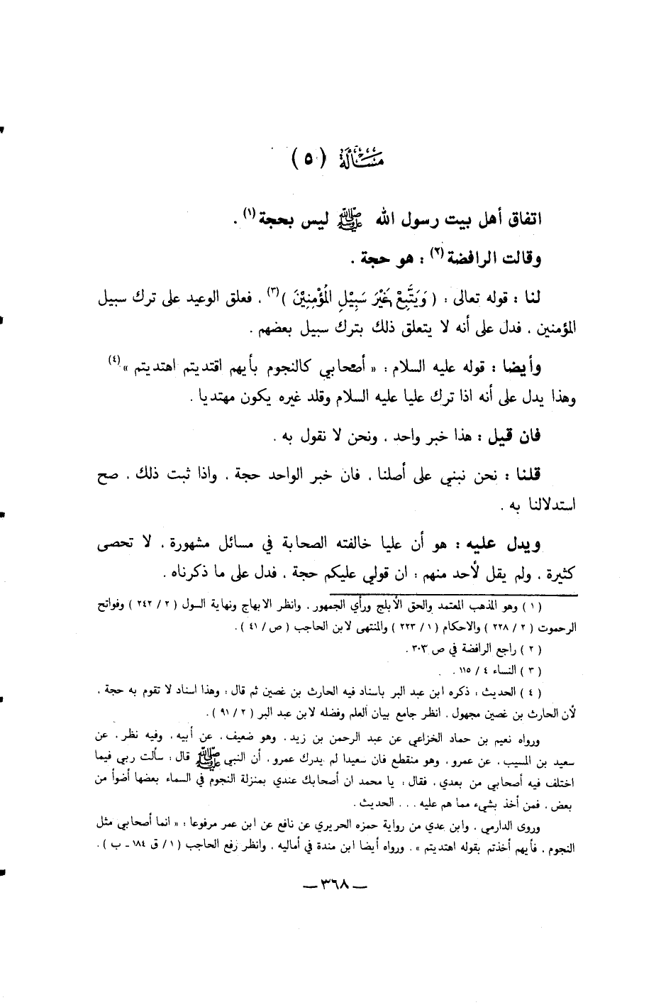 وَأَيْضًا قَوْله عَلَيْهِ السَّلَام أَصْحَابِي كَالنُّجُومِ بِأَيِّهِمْ اقْتَدَيْتُمْ اهْتَدَيْتُمْ وَهَذَا يدل على أَنه إِذا ترك عليا عَلَيْهِ السَّلَام وقلد غَيره يكون مهتديا