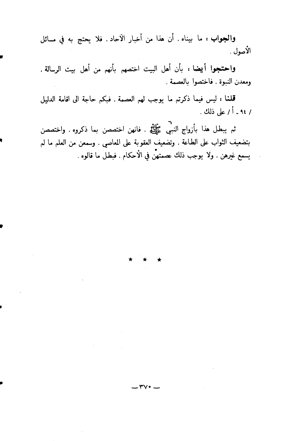 ثمَّ يبطل هَذَا بِأَزْوَاج النَّبِي صلى الله عَلَيْهِ وَسلم فَإِنَّهُنَّ اختصصن بِمَا ذَكرُوهُ واختصصن بِتَضْعِيف الثَّوَاب على الطَّاعَة وتضعيف الْعقُوبَة على الْمعاصِي وسمعن من الْعلم مَا لم يسمع غَيْرهنَّ وَلَا يُوجب ذَلِك عصمتهن فِي الْأَحْكَام فَبَطل مَا قَالُوهُ