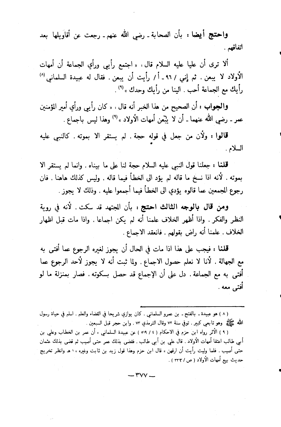 أَلا ترى أَن عليا عَلَيْهِ السَّلَام قَالَ اجْتمع رأبي ورأيي الْجَمَاعَة أَن أُمَّهَات الْأَوْلَاد لَا يبعن ثمَّ إِنِّي رَأَيْت أَن يبعن فَقَالَ لَهُ عُبَيْدَة السَّلمَانِي رَأْيك مَعَ الْجَمَاعَة أحب إِلَيْنَا من رَأْيك وَحدك