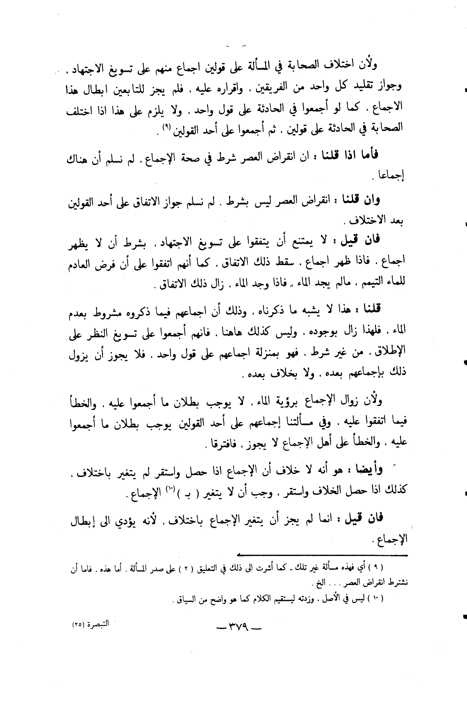 وَلِأَن زَوَال الْإِجْمَاع بِرُؤْيَة المَاء لَا يُوجب بطلَان مَا أَجمعُوا عَلَيْهِ وَالْخَطَأ فِيمَا اتَّفقُوا عَلَيْهِ وَفِي مَسْأَلَتنَا إِجْمَاعهم على أحد الْقَوْلَيْنِ يُوجب بطلَان مَا أَجمعُوا عَلَيْهِ وَالْخَطَأ على أهل الْإِجْمَاع لَا يجوز فَافْتَرقَا