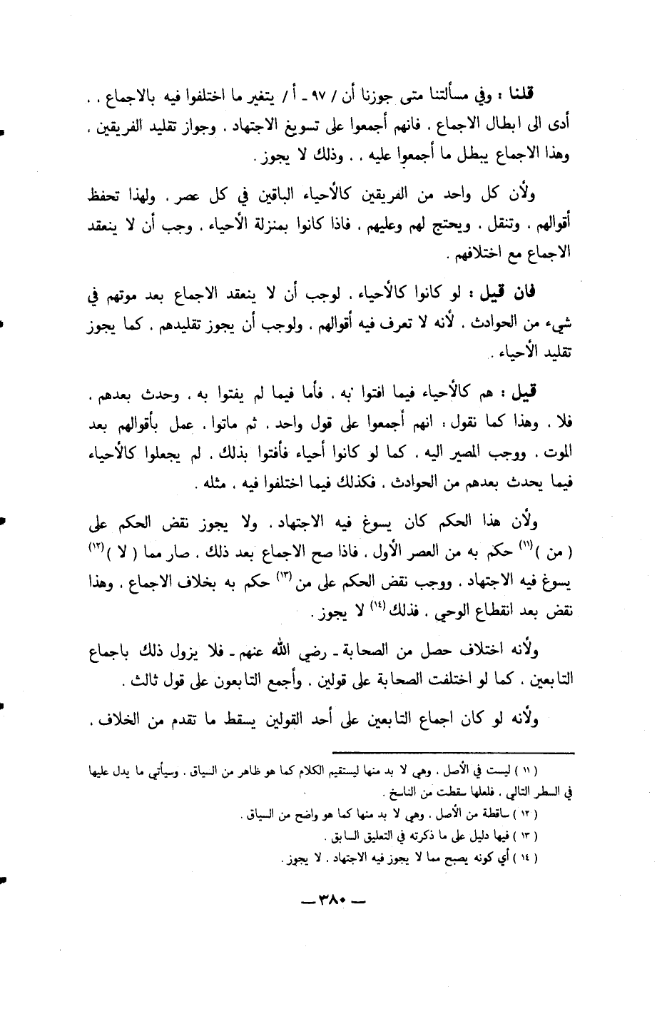 وَلِأَن كل وَاحِد من الْفَرِيقَيْنِ كالأحياء البَاقِينَ فِي كل عصر وَلِهَذَا تحفظ أَقْوَالهم وتنقل ويحتج لَهُم وَعَلَيْهِم فَإِذا كَانُوا بِمَنْزِلَة الْأَحْيَاء وَجب أَن لَا ينْعَقد الْإِجْمَاع مَعَ اخْتلَافهمْ