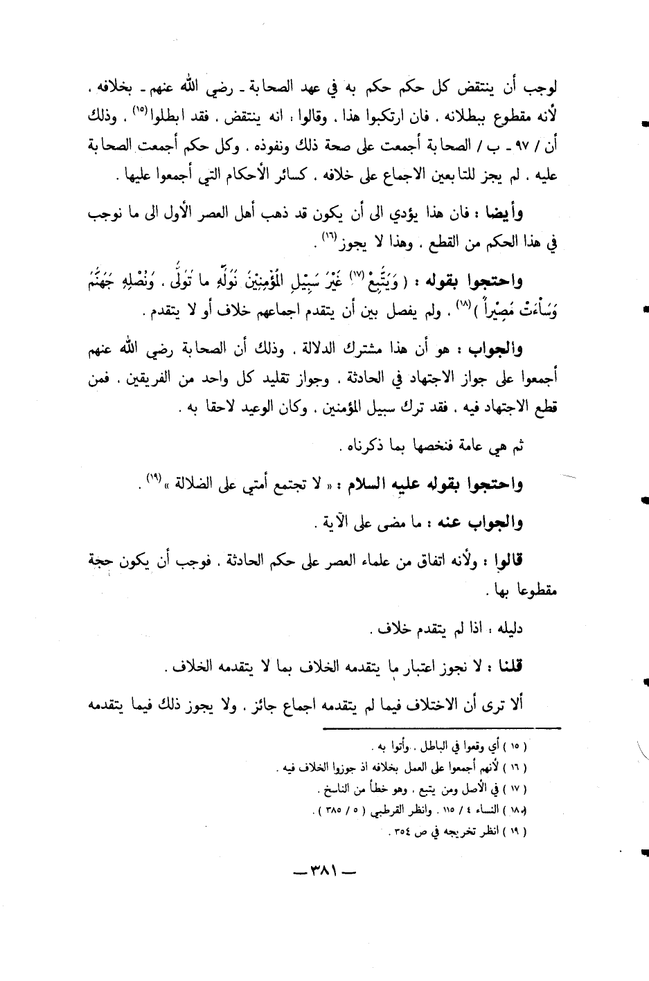 وَالْجَوَاب هُوَ أَن هَذَا مُشْتَرك الدّلَالَة وَذَلِكَ أَن الصَّحَابَة رَضِي الله عَنْهُم أَجمعُوا على جَوَاز الِاجْتِهَاد فِي الْحَادِثَة وَجَوَاز تَقْلِيد كل وَاحِد من الْفَرِيقَيْنِ فَمن قطع الِاجْتِهَاد فِيهِ فقد ترك سَبِيل الْمُؤمنِينَ وَكَانَ الْوَعيد لاحقا بِهِ