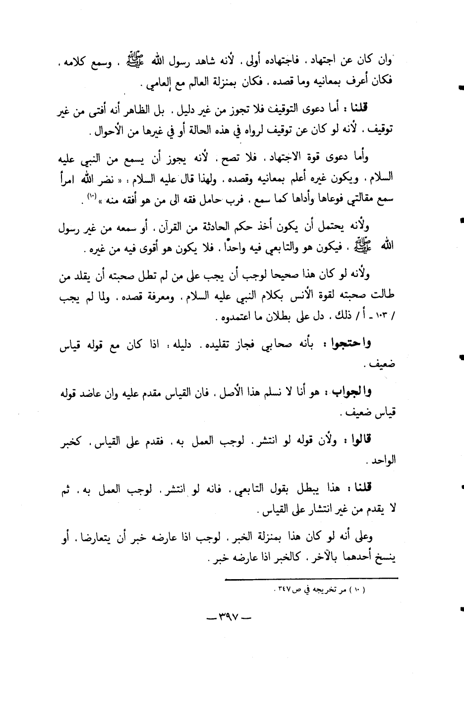 وَلِأَنَّهُ لَو كَانَ صَحِيحا لوَجَبَ أَن يجب على من لم تطل صحبته أَن يُقَلّد من طَالَتْ صحبته لقُوَّة الْأنس بِكَلَام النَّبِي عَلَيْهِ السَّلَام وَمَعْرِفَة قَصده وَلما لم يجب ذَلِك دلّ على بطلَان مَا اعتمدوه