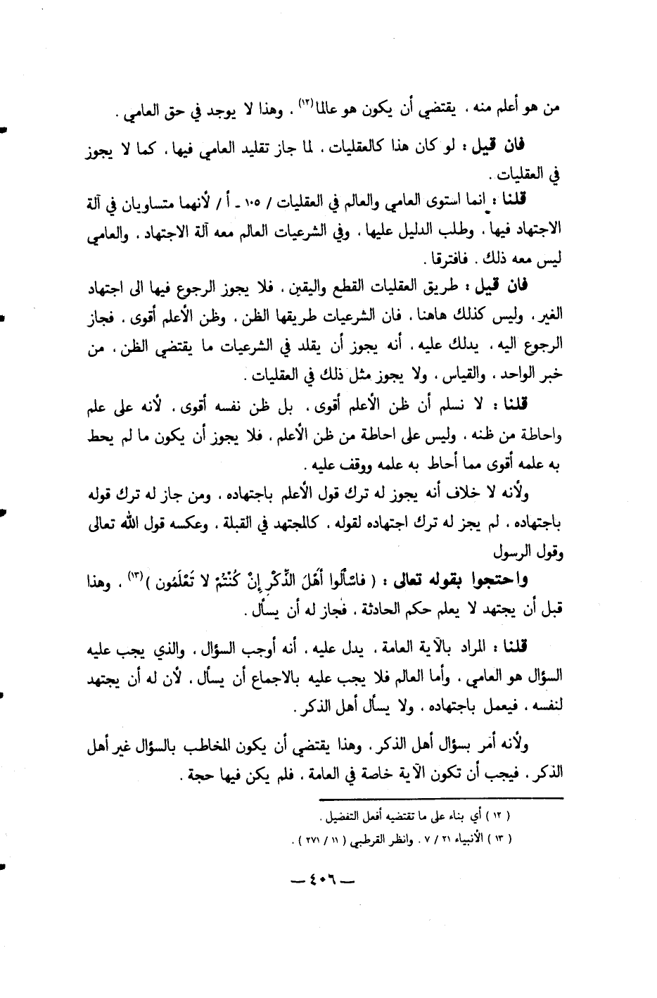 فَإِن قيل طَرِيق العقليات الْقطع وَالْيَقِين فَلَا يجوز الرُّجُوع فِيهَا إِلَى اجْتِهَاد الْغَيْر وَلَيْسَ كَذَلِك هَاهُنَا فَإِن الشرعيات طريقها الظَّن وَظن الأعلم أقوى فَجَاز الرُّجُوع إِلَيْهِ يدلك عَلَيْهِ أَنه يجوز أَن يُقَلّد فِي الشرعيات مَا يَقْتَضِي الظَّن من خبر الْوَاحِد وَالْقِيَاس وَلَا يجوز مثل ذَلِك فِي العقليات