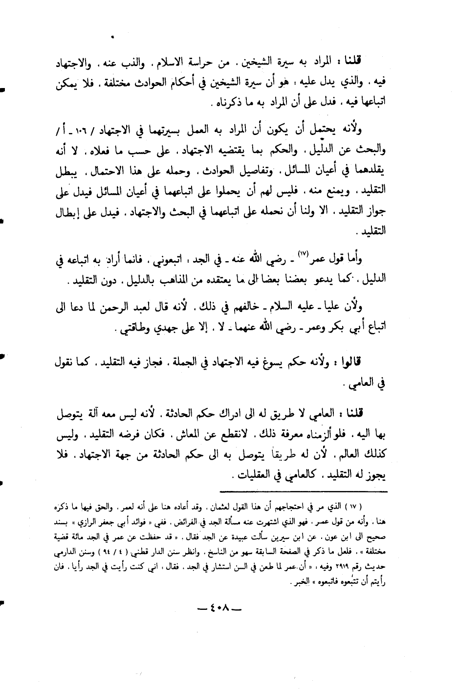 وَأما قَول عمر رَضِي الله عَنهُ فِي الْجد اتبعوني فَإِنَّمَا أَرَادَ بِهِ اتِّبَاعه فِي الدَّلِيل كَمَا يَدْعُو بَعْضنَا بَعْضًا إِلَى مَا يَعْتَقِدهُ من الْمذَاهب بِالدَّلِيلِ دون التَّقْلِيد