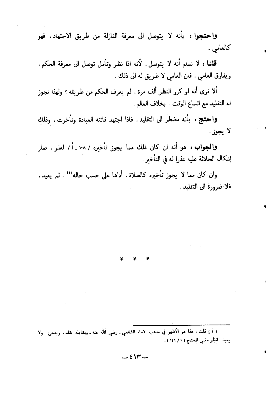 وَاحْتج بِأَنَّهُ مُضْطَر إِلَى التَّقْلِيد فَإِذا اجْتهد فَاتَتْهُ الْعِبَادَة وتأخرت وَذَلِكَ لَا يجوز