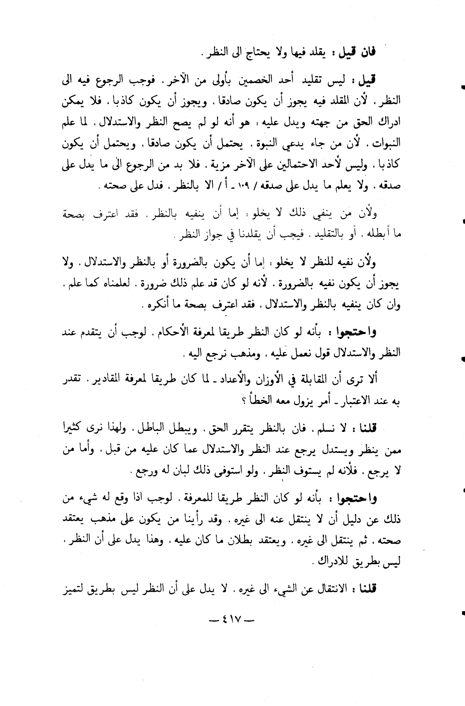 قيل لَيْسَ تَقْلِيد أحد الْخَصْمَيْنِ بِأولى من الآخر فَوَجَبَ الرُّجُوع فِيهِ إِلَى النّظر لِأَن الْمُقَلّد فِيهِ يجوز أَن يكون صَادِقا وَيجوز أَن يكون كَاذِبًا فَلَا يُمكن إِدْرَاك الْحق من جِهَته وَيدل عَلَيْهِ هُوَ أَنه لَو لم يَصح النّظر وَالِاسْتِدْلَال لما علم النبوات لِأَن من جَاءَ يَدعِي النُّبُوَّة يحْتَمل أَن يكون صَادِقا وَيحْتَمل أَن يكون كَاذِبًا وَلَيْسَ لأحد الِاحْتِمَالَيْنِ على الآخر مزية فَلَا بُد من الرُّجُوع إِلَى مَا يدل على صدقه وَلَا يعلم مَا يدل على صدقه إِلَّا بِالنّظرِ فَدلَّ على صِحَّته