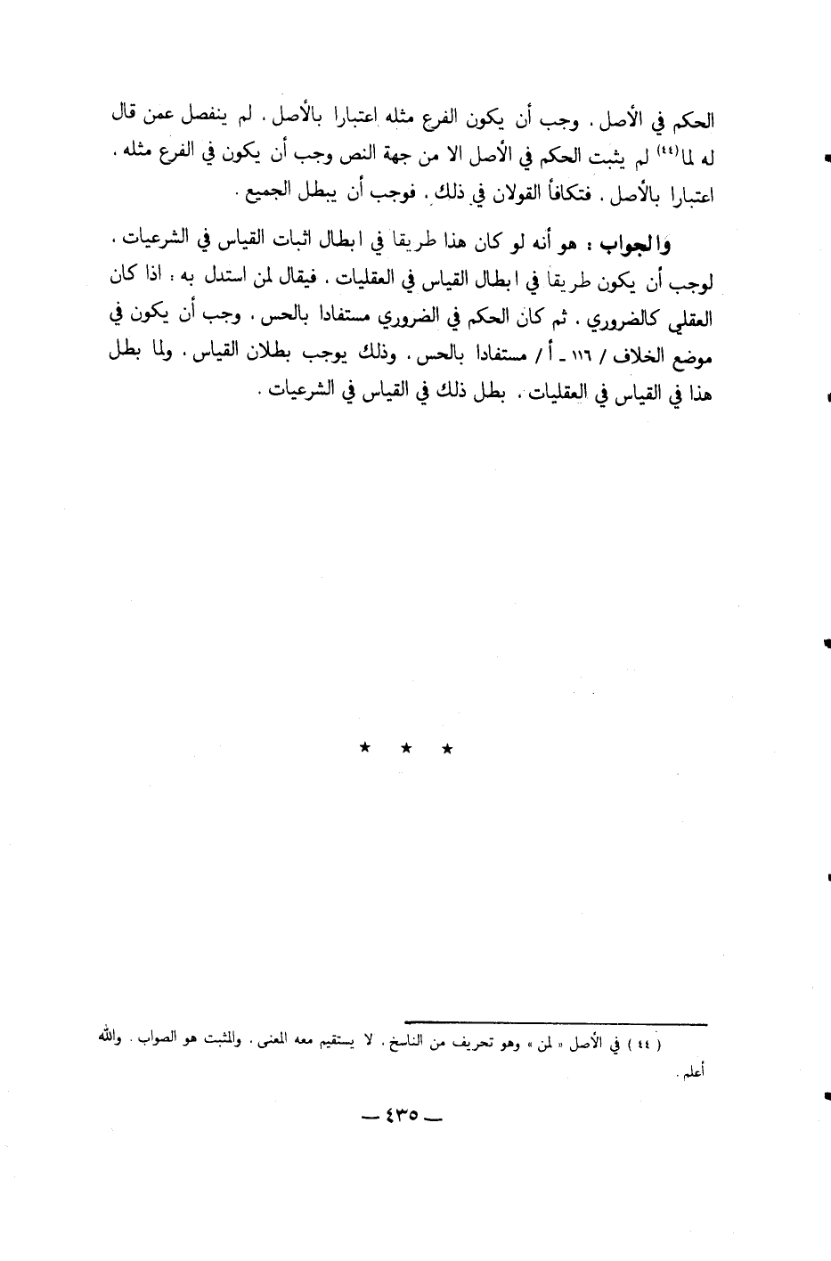 وَالْجَوَاب هُوَ أَنه لَو كَانَ هَذَا طَرِيقا فِي إبِْطَال إِثْبَات الْقيَاس فِي الشرعيات لوَجَبَ أَن يكون طَرِيقا فِي إبِْطَال الْقيَاس فِي العقليات فَيُقَال لمن اسْتدلَّ بِهِ إِذا كَانَ الْعقلِيّ كالضروري ثمَّ كَانَ الحكم فِي الضَّرُورِيّ مستفادا بالحس وَجب أَن يكون فِي مَوضِع الْخلاف مستفادا بالحس وَذَلِكَ يُوجب بطلَان الْقيَاس وَلما بَطل هَذَا فِي الْقيَاس فِي العقليات بَطل ذَلِك فِي الْقيَاس فِي الشرعيات