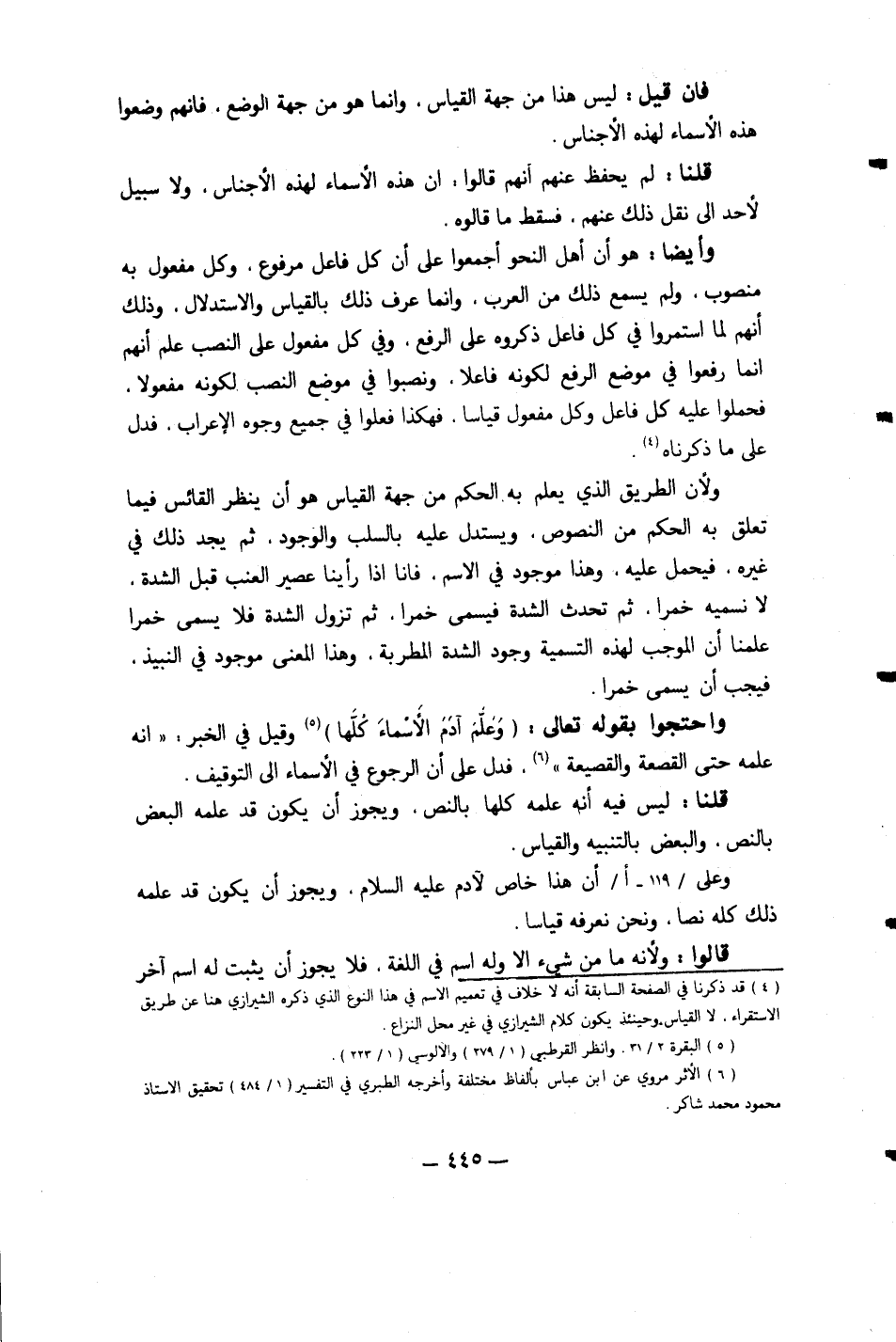 وَأَيْضًا هُوَ أَن أهل النَّحْو أَجمعُوا على أَن كل فَاعل مَرْفُوع وكل مفعول بِهِ مَنْصُوب وَلم يسمع ذَلِك من الْعَرَب وَإِنَّمَا عرف ذَلِك بِالْقِيَاسِ وَالِاسْتِدْلَال وَذَلِكَ أَنهم لما استمروا فِي كل فَاعل ذَكرُوهُ على الرّفْع وَفِي كل مفعول على النصب علم أَنهم إِنَّمَا رفعوا فِي مَوضِع الرّفْع لكَونه فَاعِلا ونصبوا فِي مَوضِع النصب لكَونه مَفْعُولا فحملوا عَلَيْهِ كل فَاعل وكل مفعول قِيَاسا فَهَكَذَا فعلوا فِي جَمِيع وُجُوه الْإِعْرَاب فَدلَّ على مَا ذَكرْنَاهُ