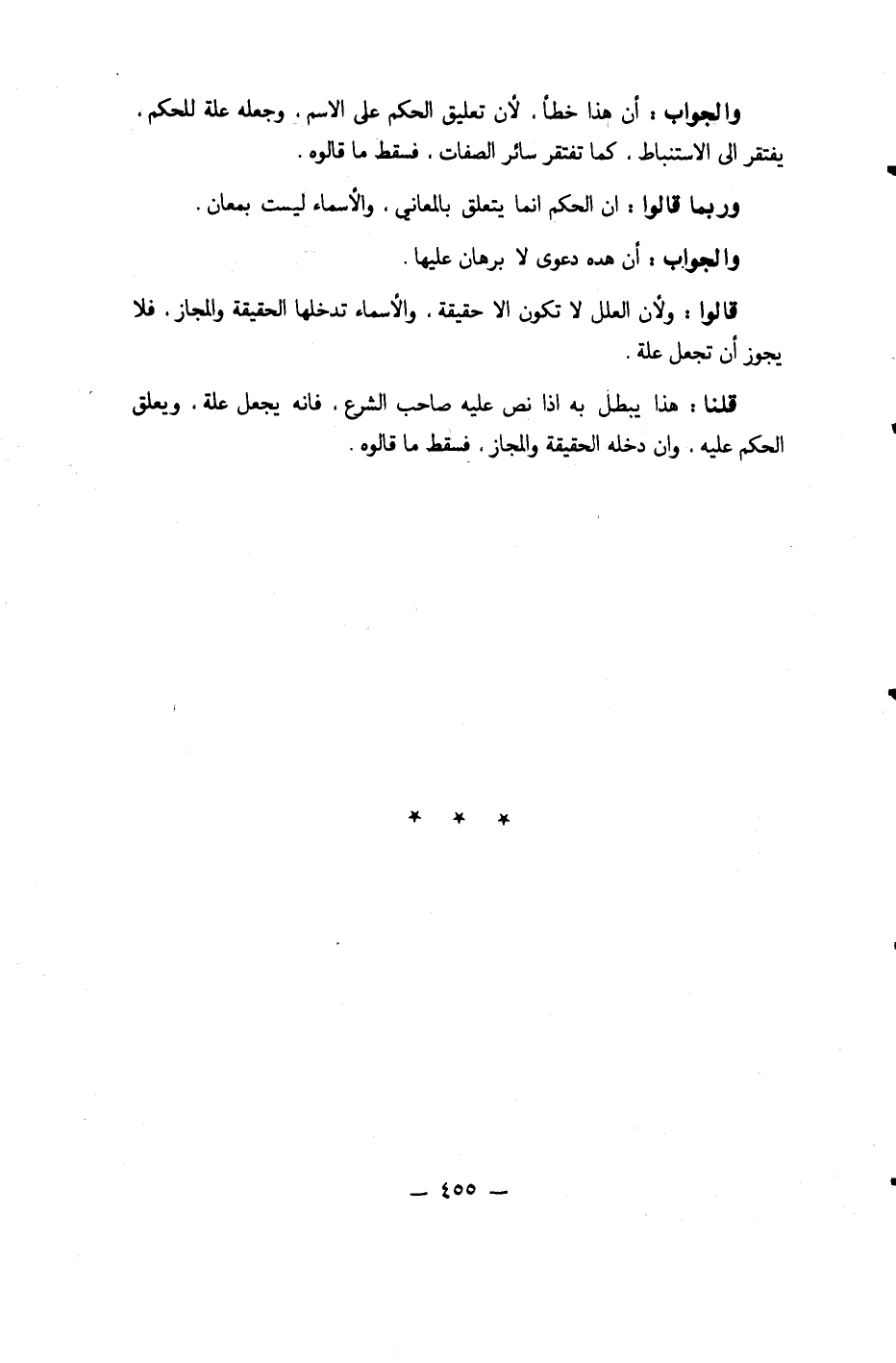 قَالُوا وَلِأَن الْعِلَل لَا تكون إِلَّا حَقِيقَة والأسماء تدْخلهَا الْحَقِيقَة وَالْمجَاز فَلَا يجوز أَن تجْعَل عِلّة