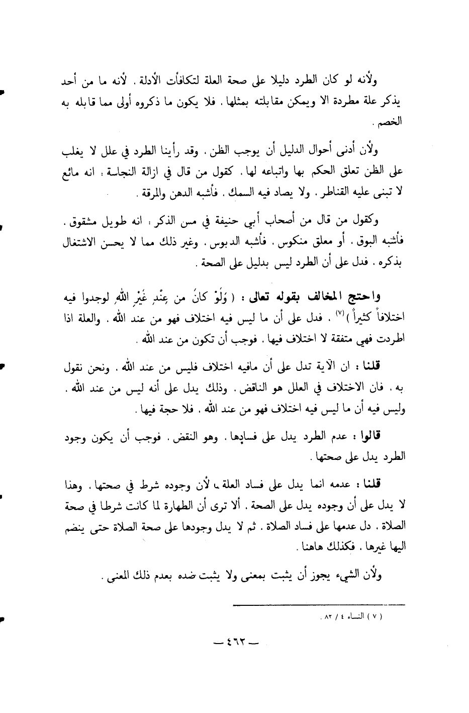 قُلْنَا إِن الْآيَة تدل على أَن مَا فِيهِ اخْتِلَاف فَلَيْسَ من عِنْد الله وَنحن نقُول بِهِ فَإِن الِاخْتِلَاف فِي الْعِلَل هُوَ الناقض وَذَلِكَ يدل على أَنه لَيْسَ من عِنْد الله وَلَيْسَ فِيهِ أَن مَا لَيْسَ فِيهِ اخْتِلَاف فَهُوَ من عِنْد الله فَلَا حجَّة فِيهَا