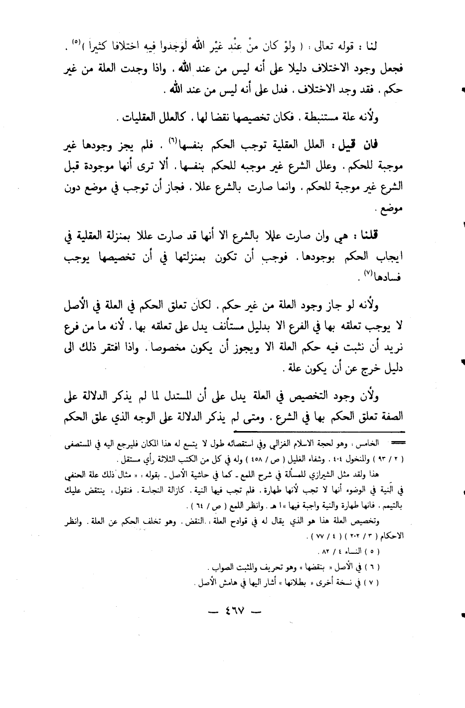 لنا قَوْله تَعَالَى {وَلَو كَانَ من عِنْد غير الله لوجدوا فِيهِ اخْتِلَافا كثيرا} فَجعل وجود الِاخْتِلَاف دَلِيلا على أَنه لَيْسَ من عِنْد الله وَإِذا وجدت الْعلَّة من غير حكم فقد وجد الِاخْتِلَاف فَدلَّ على أَنه لَيْسَ من عِنْد الله