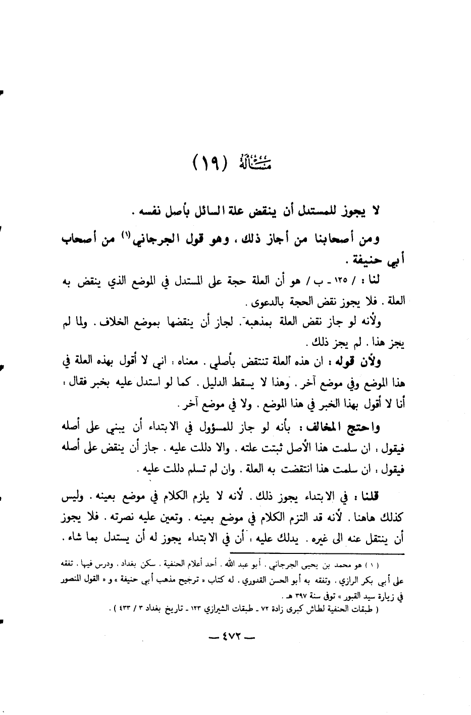 قُلْنَا فِي الِابْتِدَاء يجوز ذَلِك لِأَنَّهُ لَا يلْزم الْكَلَام فِي مَوضِع بِعَيْنِه وَلَيْسَ كَذَلِك هَاهُنَا لِأَنَّهُ قد الْتزم الْكَلَام فِي مَوضِع بِعَيْنِه وَتعين عَلَيْهِ نصرته فَلَا يجوز أَن ينْتَقل عَنهُ إِلَى غَيره يدلك عَلَيْهِ أَن فِي الِابْتِدَاء يجوز لَهُ أَن يسْتَدلّ بِمَا شَاءَ