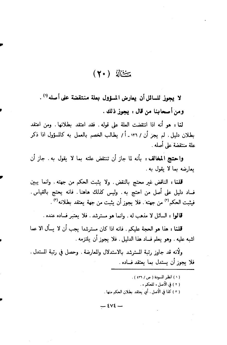 لَا يجوز للسَّائِل أَن يُعَارض المسؤول بعلة منتقضة على أَصله