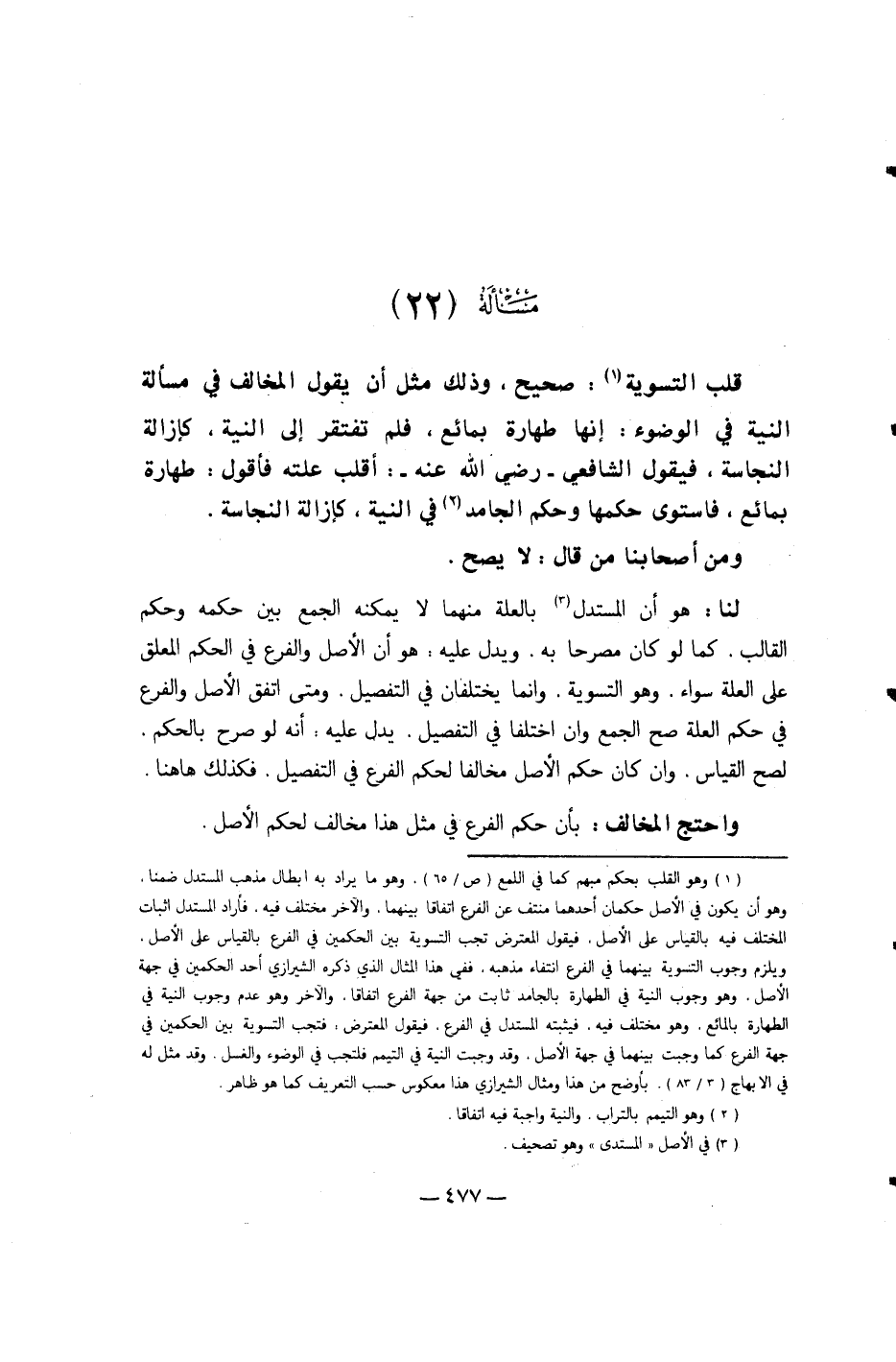 قلب التَّسْوِيَة صَحِيح وَذَلِكَ مثل أَن يَقُول الْمُخَالف فِي مَسْأَلَة النِّيَّة فِي الْوضُوء إِنَّهَا طَهَارَة بمائع فَلم تفْتَقر إِلَى النِّيَّة كإزالة النَّجَاسَة فَيَقُول الشَّافِعِي رَضِي الله عَنهُ أقلب علته فَأَقُول طَهَارَة بمائع فَاسْتَوَى حكمهَا وَحكم الجامد فِي النِّيَّة كإزالة النَّجَاسَة