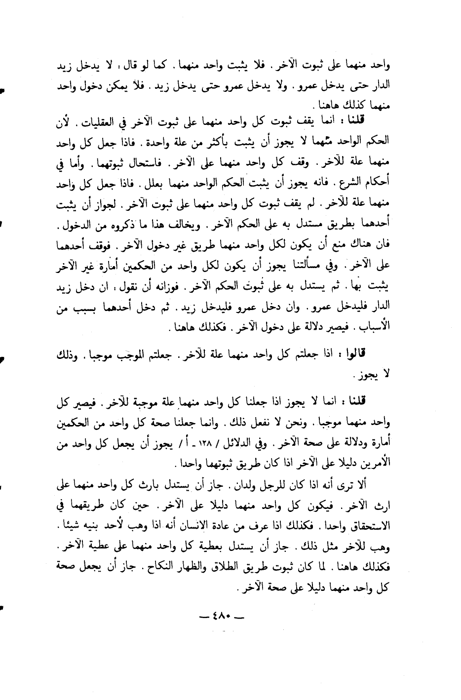 قُلْنَا إِنَّمَا لَا يجوز إِذا جعلنَا كل وَاحِد مِنْهُمَا عِلّة مُوجبَة للْآخر فَيصير كل وَاحِد مِنْهُمَا مُوجبا وَنحن لَا نَفْعل ذَلِك وَإِنَّمَا جعلنَا صِحَة كل وَاحِد من الْحكمَيْنِ أَمارَة وَدلَالَة على صِحَة الآخر وَفِي الدَّلَائِل يجوز أَن يَجْعَل كل وَاحِد من الْأَمريْنِ دَلِيلا على الآخر إِذا كَانَ طَرِيق ثبوتهما وَاحِدًا