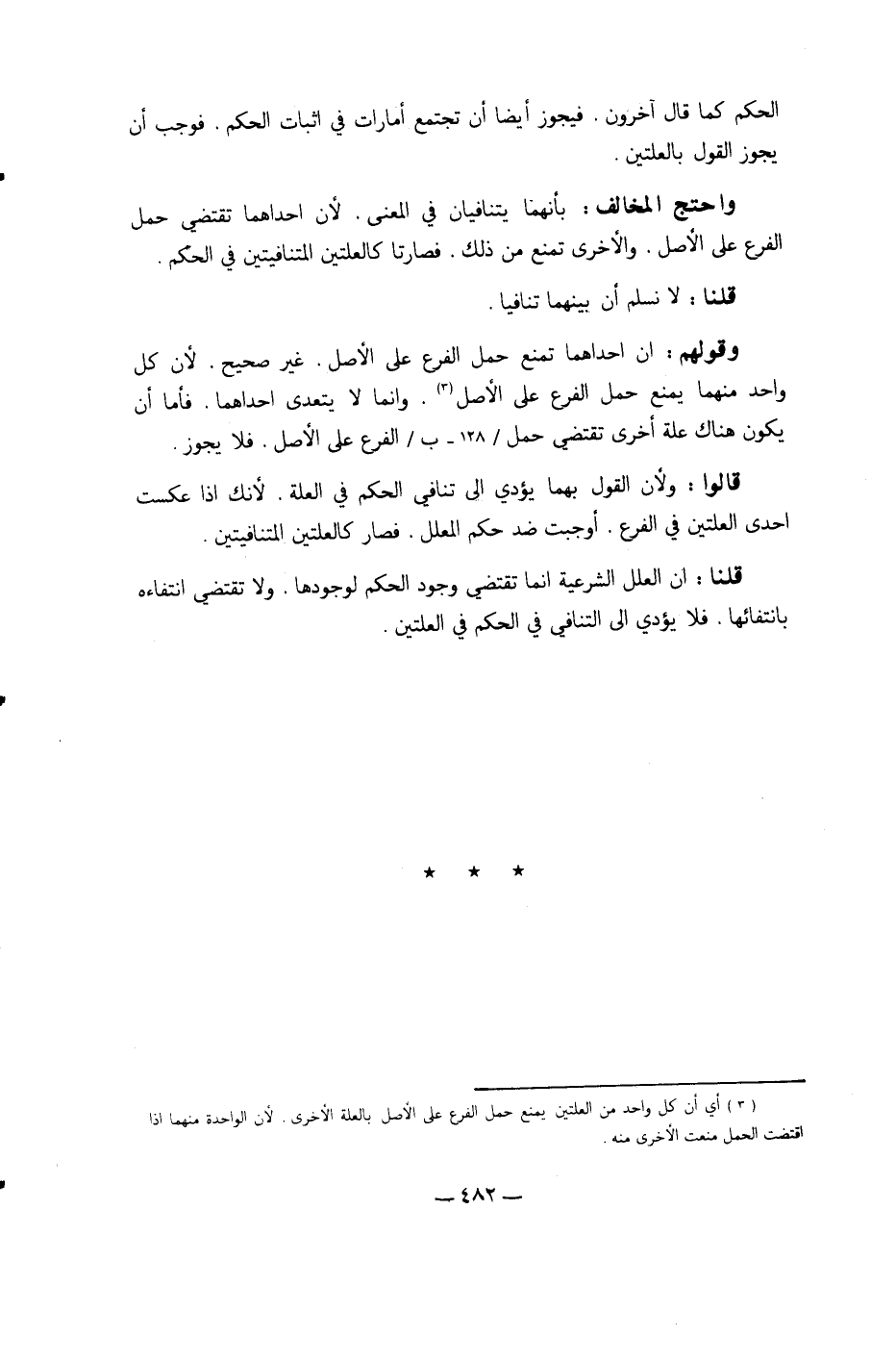 قُلْنَا إِن الْعِلَل الشَّرْعِيَّة إِنَّمَا تَقْتَضِي وجود الحكم لوجودها وَلَا تَقْتَضِي انتفاءه بانتفائها فَلَا يُؤَدِّي إِلَى التَّنَافِي فِي الحكم فِي العلتين