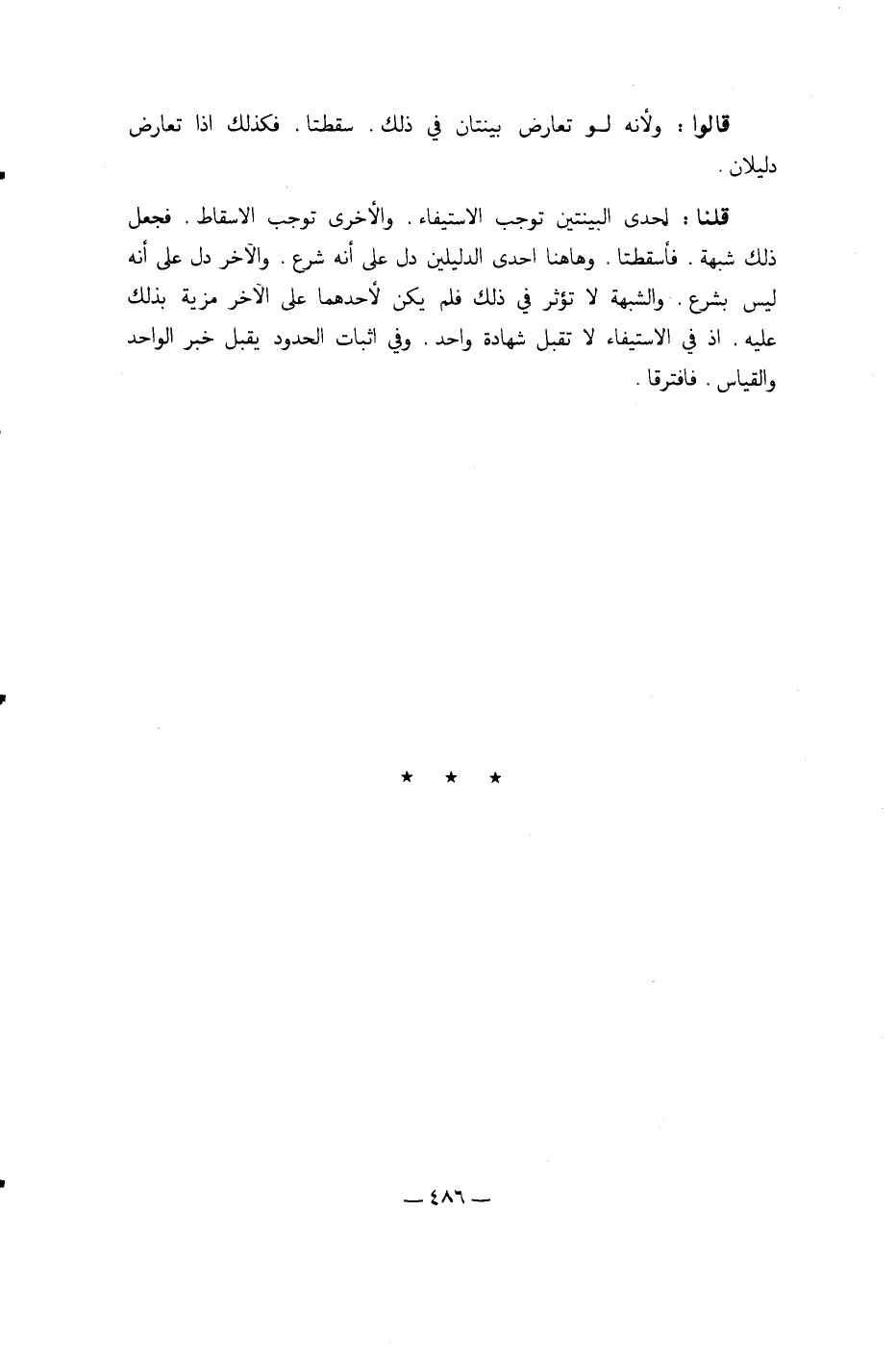 قُلْنَا إِحْدَى البيئتين توجب الِاسْتِيفَاء وَالْأُخْرَى توجب الْإِسْقَاط فَجعل ذَلِك شُبْهَة فأسقطتا وَهَاهُنَا إِحْدَى الدَّلِيلَيْنِ دلّ على أَنه شرع وَالْآخر دلّ على أَنه لَيْسَ بشرع والشبهة لَا تُؤثر فِي ذَلِك فَلم يكن لأَحَدهمَا على الآخر مزية بذلك عَلَيْهِ إِذْ فِي الاتسيفاء لَا تقبل شَهَادَة وَاحِد وَفِي إِثْبَات الْحُدُود يقبل خبر الْوَاحِد وَالْقِيَاس فَافْتَرقَا
