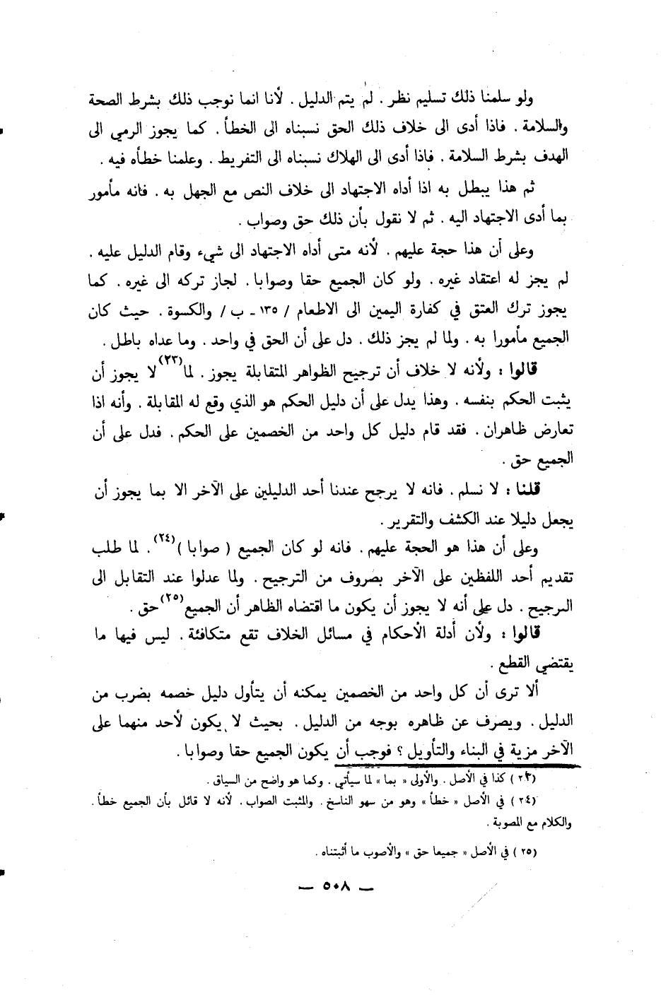 وعَلى أَن هَذَا هُوَ الْحجَّة عَلَيْهِم فَإِنَّهُ لَو كَانَ الْجَمِيع صَوَابا لما طلب تَقْدِيم أحد اللَّفْظَيْنِ على الآخر بصروف من التَّرْجِيح وَلما عدلوا عِنْد التقابل إِلَى التَّرْجِيح دلّ على أَنه لَا يجوز أَن يكون مَا اقْتَضَاهُ الظَّاهِر أَن الْجَمِيع حق