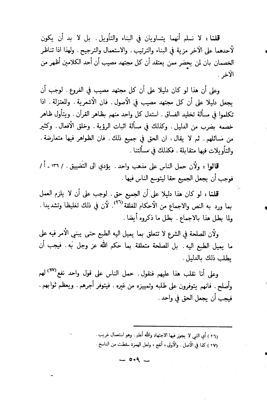 وعَلى أَنا نقلب هَذَا عَلَيْهِم فَنَقُول حمل النَّاس على قَول وَاحِد نفع لَهُم وَأصْلح فَإِنَّهُم يتوافرون على طلبه وتمييزه من غَيره فيتوفر أجرهم ويعظم ثوابهم فَيجب أَن يَجْعَل الْحق فِي وَاحِد