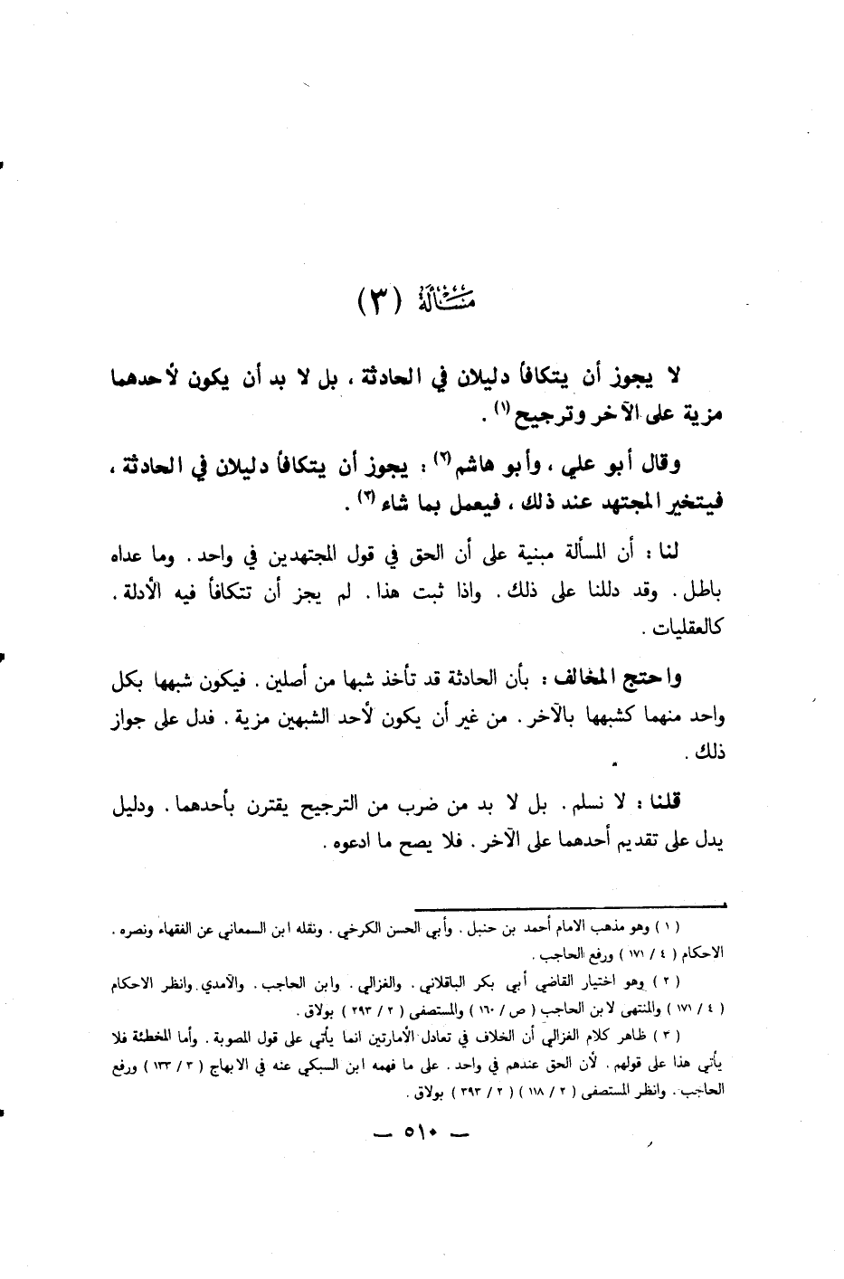 لَا يجوز أَن يتكافأ دليلان فِي الْحَادِثَة بل لَا بُد أَن يكون لأَحَدهمَا مزية على الآخر وترجيح