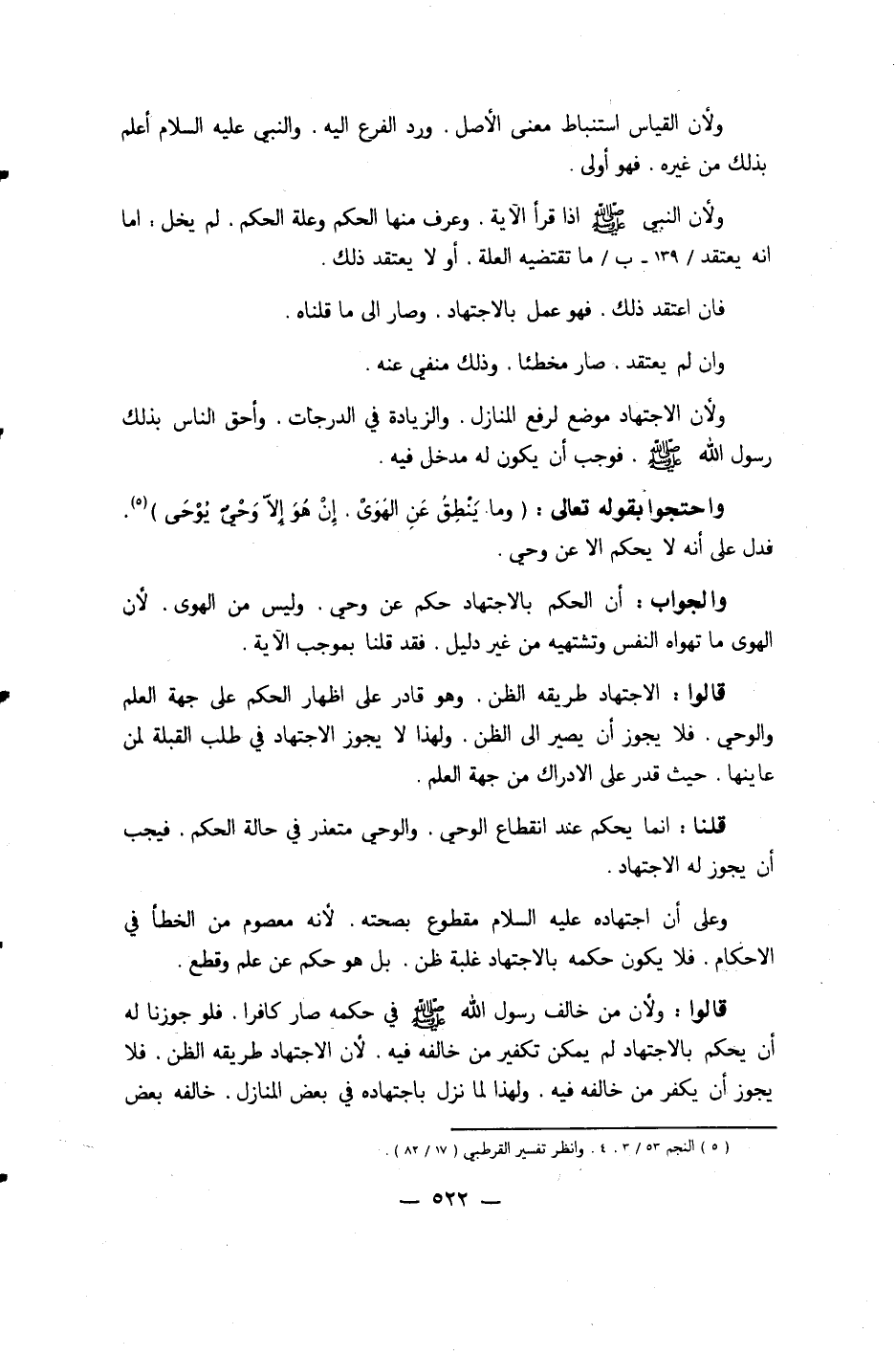 وعَلى أَن اجْتِهَاده عَلَيْهِ السَّلَام مَقْطُوع بِصِحَّتِهِ لِأَنَّهُ مَعْصُوم من الْخَطَأ فِي الْأَحْكَام فَلَا يكون حكمه بِالِاجْتِهَادِ غَلَبَة ظن بل هُوَ حكم عَن علم وَقطع