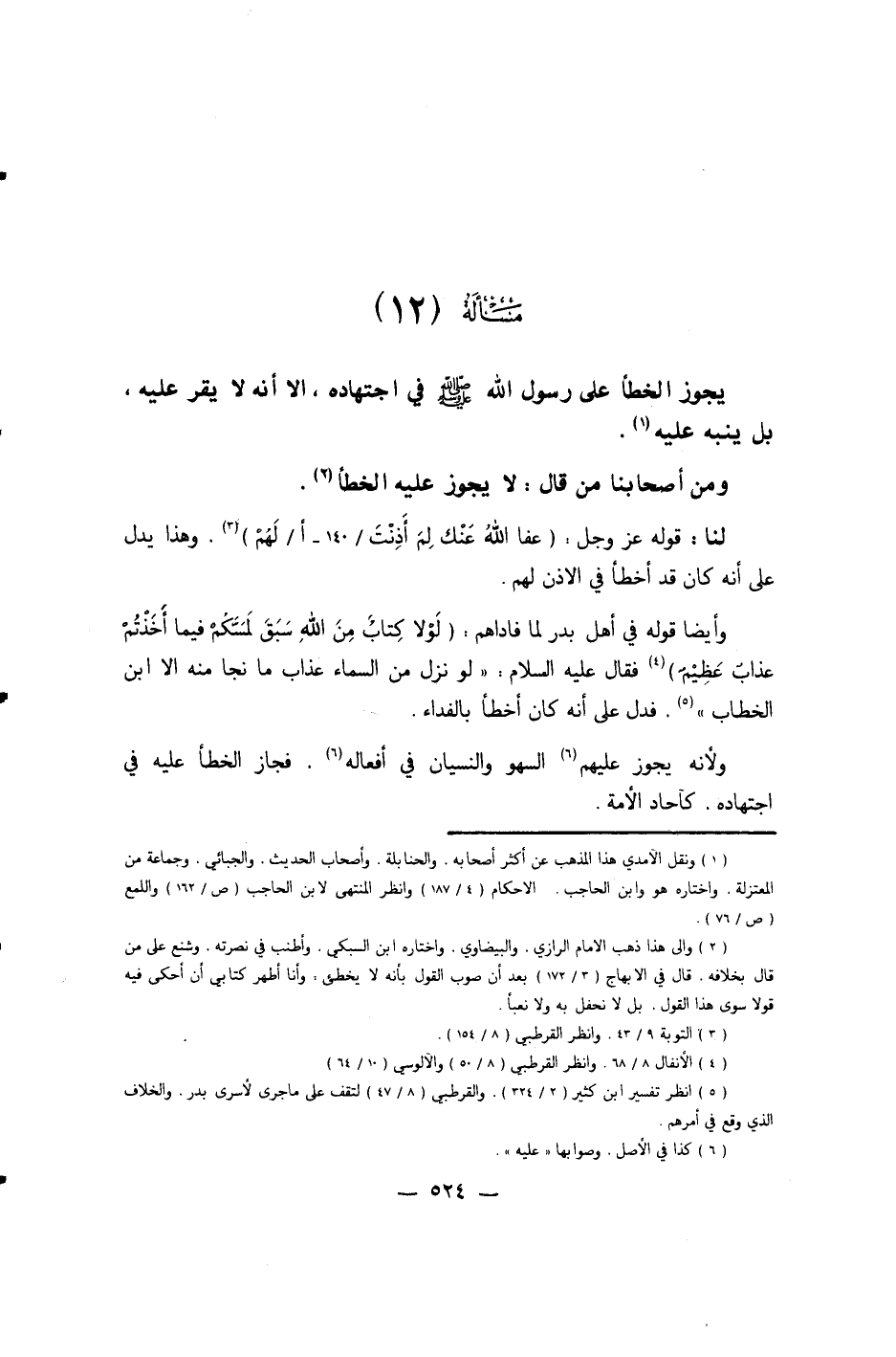 يجوز الْخَطَأ على رَسُول الله صلى الله عَلَيْهِ وَسلم فِي اجْتِهَاده إِلَّا أَنه لَا يقْرَأ عَلَيْهِ بل يُنَبه عَلَيْهِ