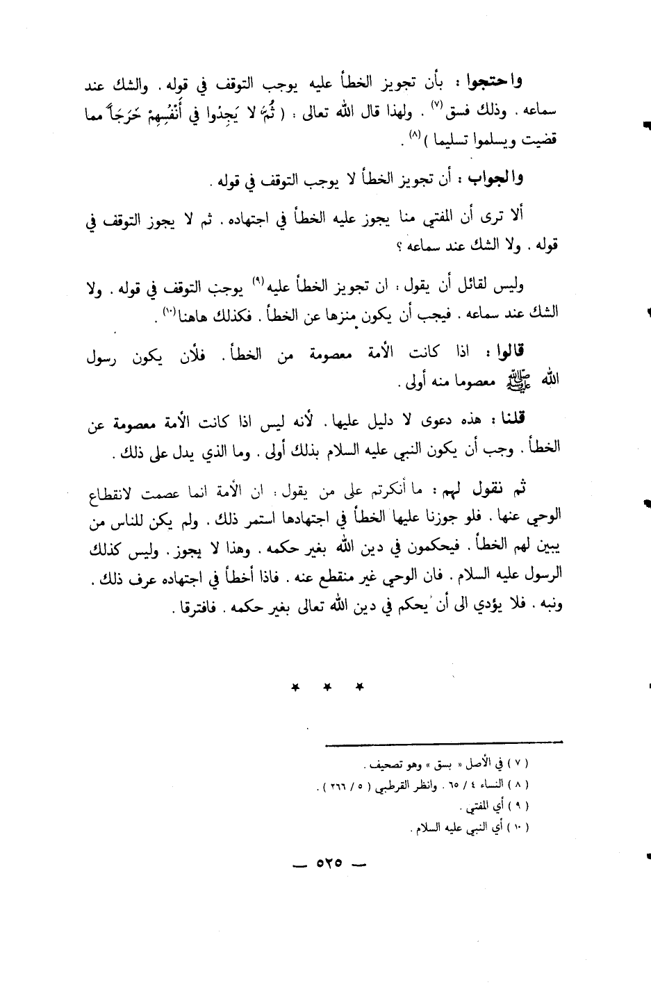 ثمَّ نقُول لَهُم مَا أنكرتم على من يَقُول إِن الْأمة إِنَّمَا عصمت لانْقِطَاع الْوَحْي عَنْهَا فَلَو جَوَّزنَا عَلَيْهَا الْخَطَأ فِي اجتهادها اسْتمرّ ذَلِك وَلم يكن للنَّاس من يبين لَهُم الْخَطَأ فيحكمون فِي دين الله بِغَيْر حكمه وَهَذَا لَا يجوز وَلَيْسَ كَذَلِك الرَّسُول عَلَيْهِ السَّلَام فَإِن الْوَحْي غير مُنْقَطع عَنهُ فَإِذا أَخطَأ فِي اجْتِهَاده عرف ذَلِك وَنبهَ فَلَا يُؤَدِّي إِلَى أَن يحكم فِي دين الله تَعَالَى بِغَيْر حكمه فَافْتَرقَا