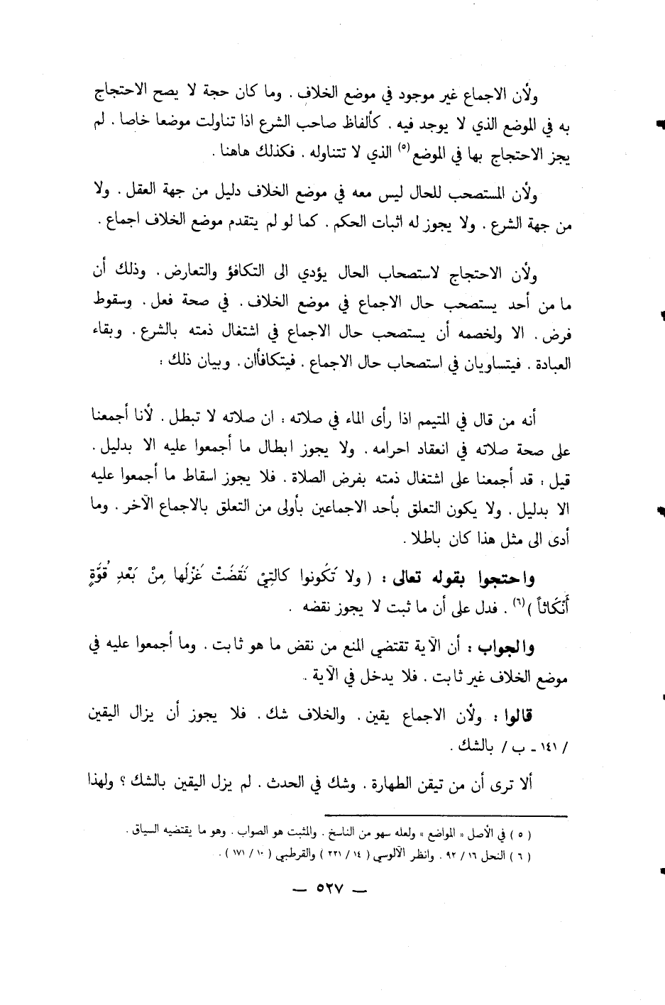 وَلِأَن الِاحْتِجَاج لاستصحاب الْحَال يُؤَدِّي إِلَى التكافؤ والتعارض وَذَلِكَ أَن مَا من أحد يستصحب حَال الْإِجْمَاع فِي مَوضِع الْخلاف فِي صِحَة فعل وَسُقُوط فرض إِلَّا ولخصمه أَن يسصحب حَال الْإِجْمَاع فِي اشْتِغَال ذمَّته بِالشَّرْعِ وَبَقَاء الْعِبَادَة فيتساويان فِي اسْتِصْحَاب حَال الْإِجْمَاع فيتكافآن وَبَيَان ذَلِك